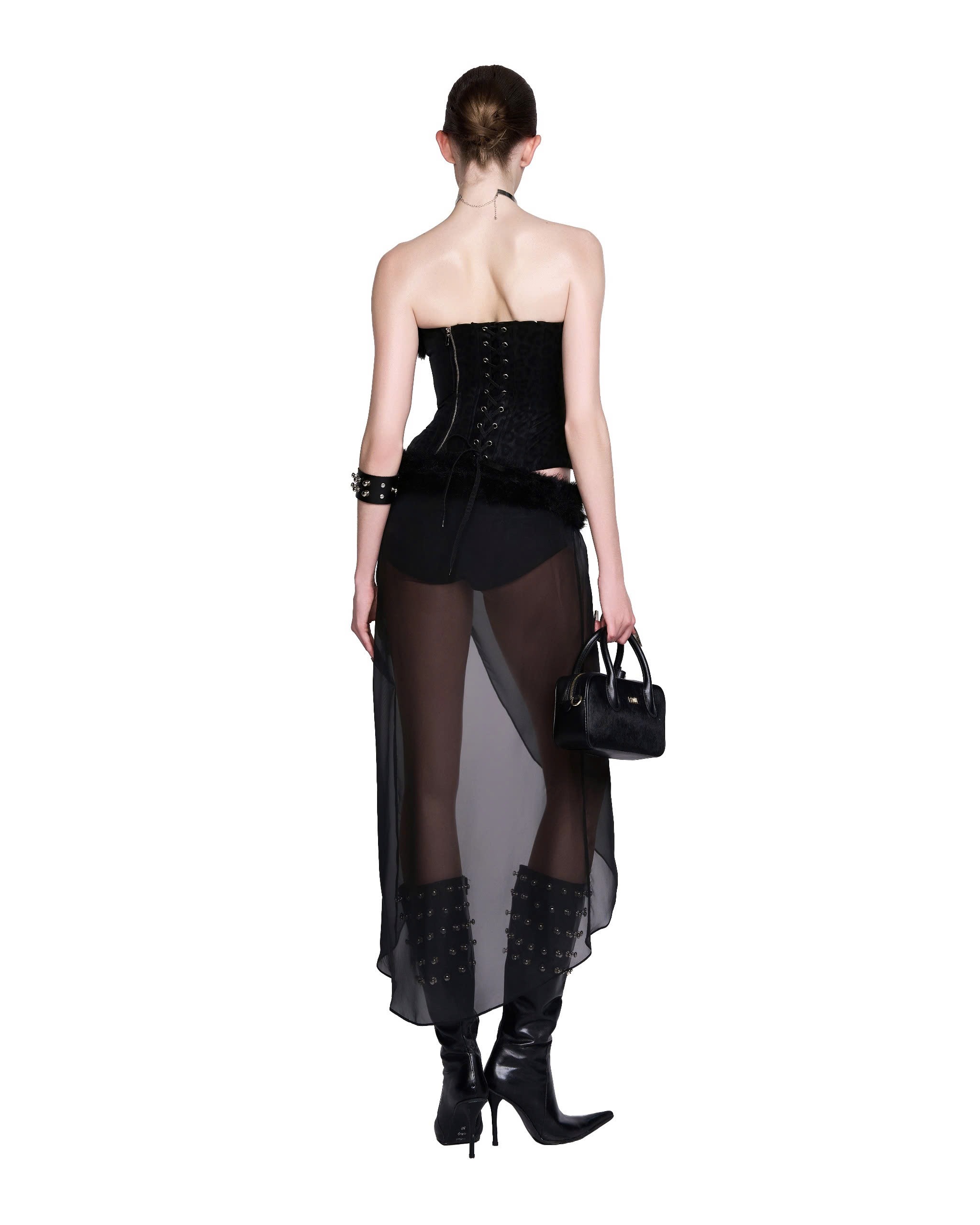 A bold, structured black leopard print corset that is both unique and irresistibly alluring.