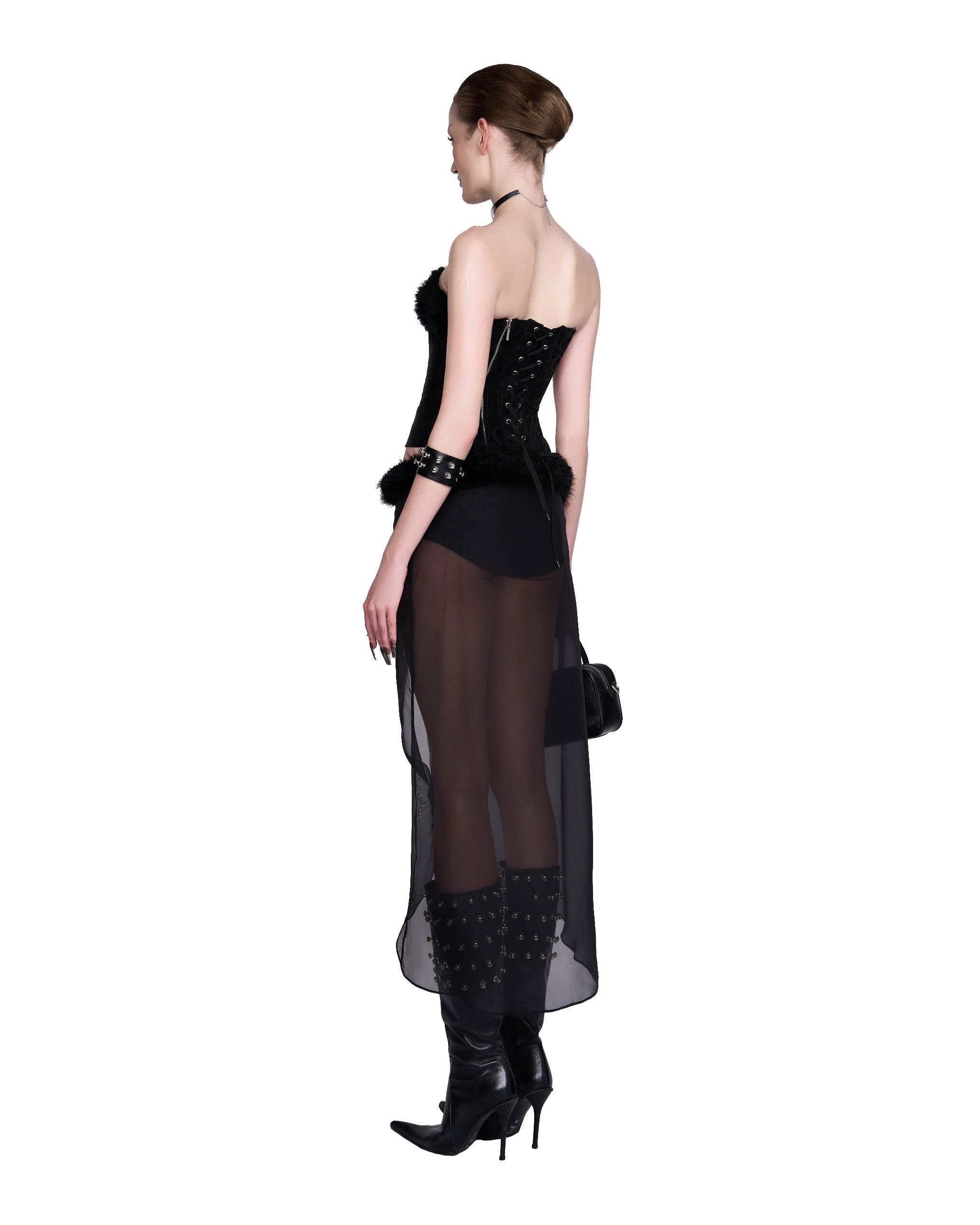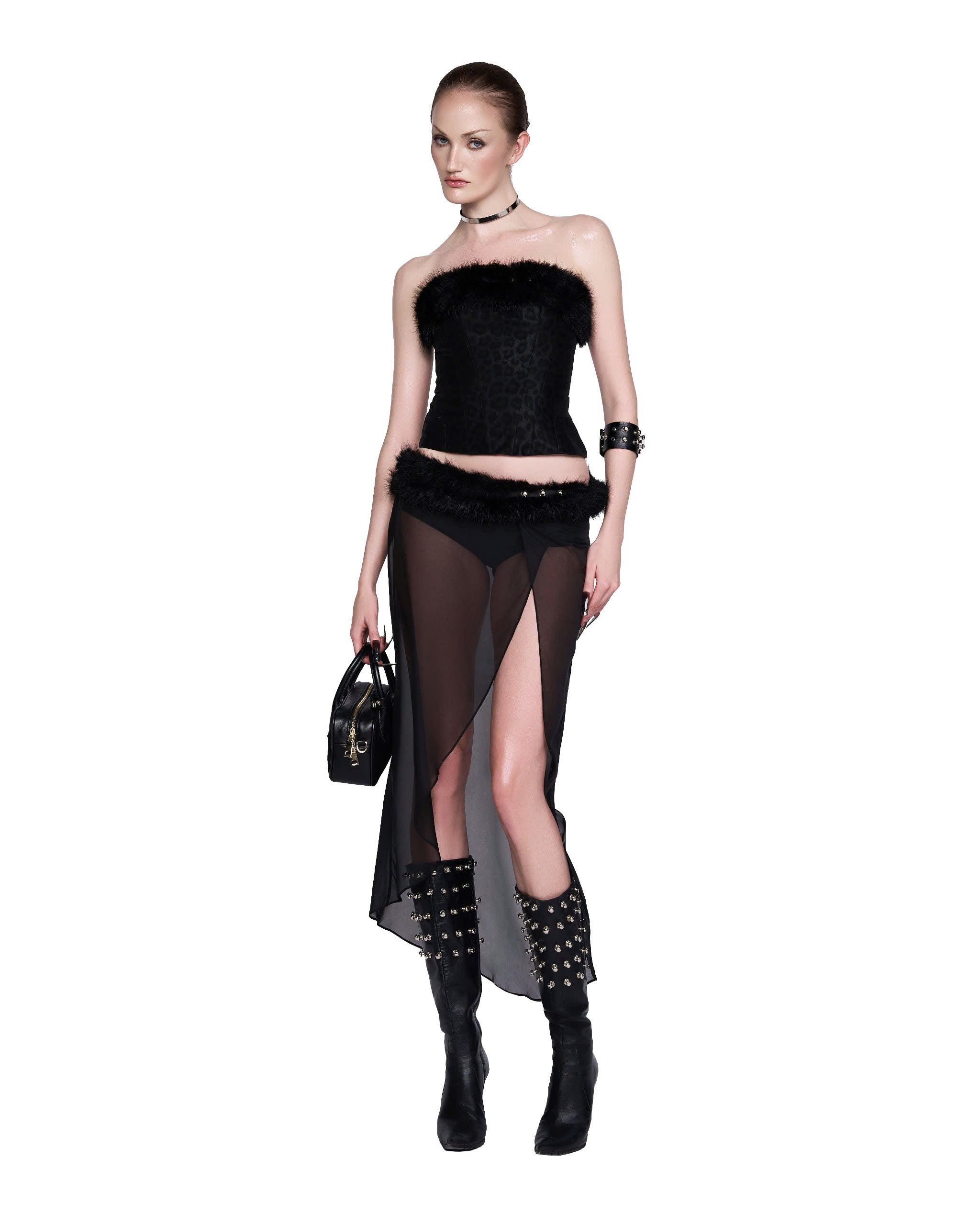Paired with a fur waistband, high quality cowhide leather straps studded accents.
