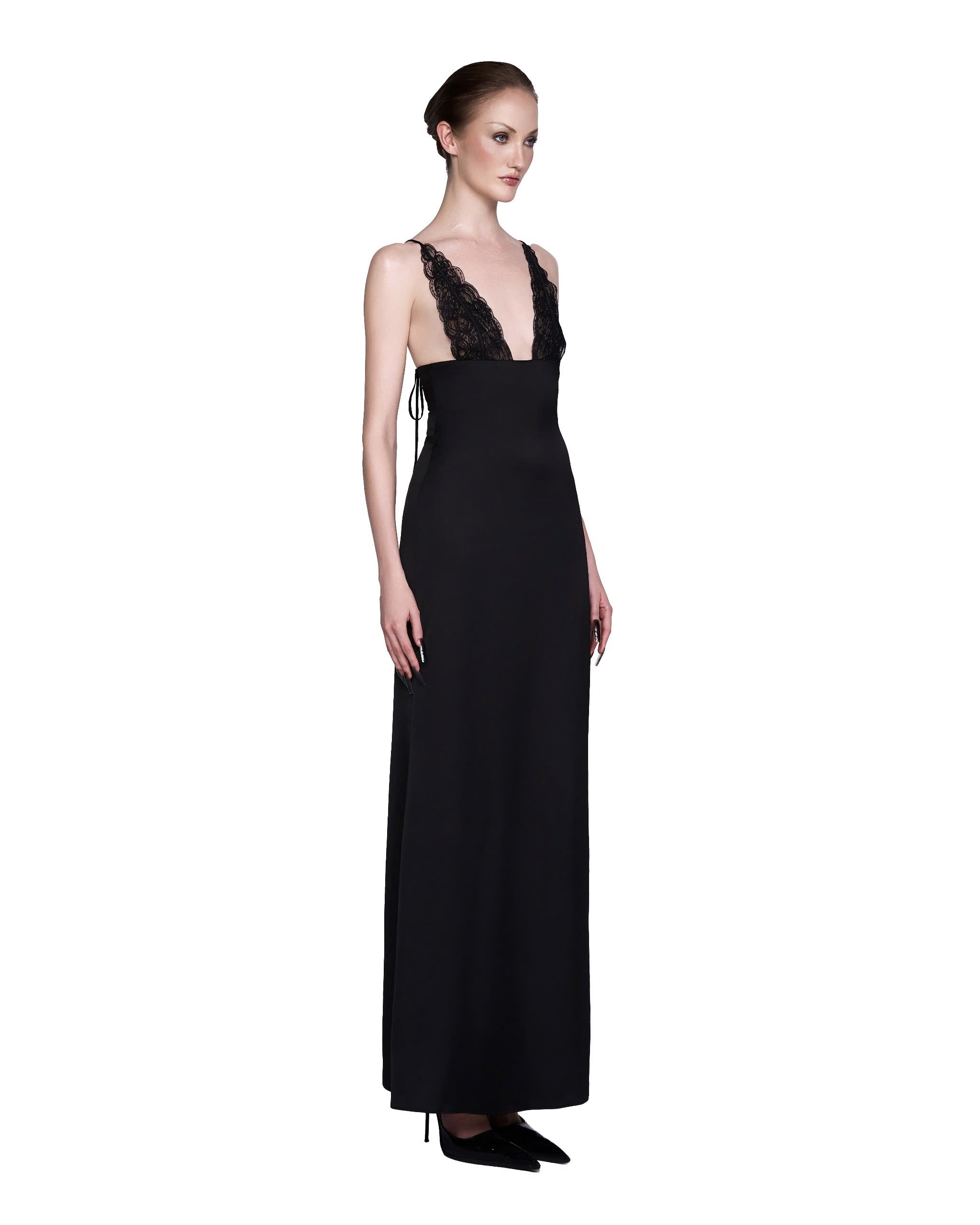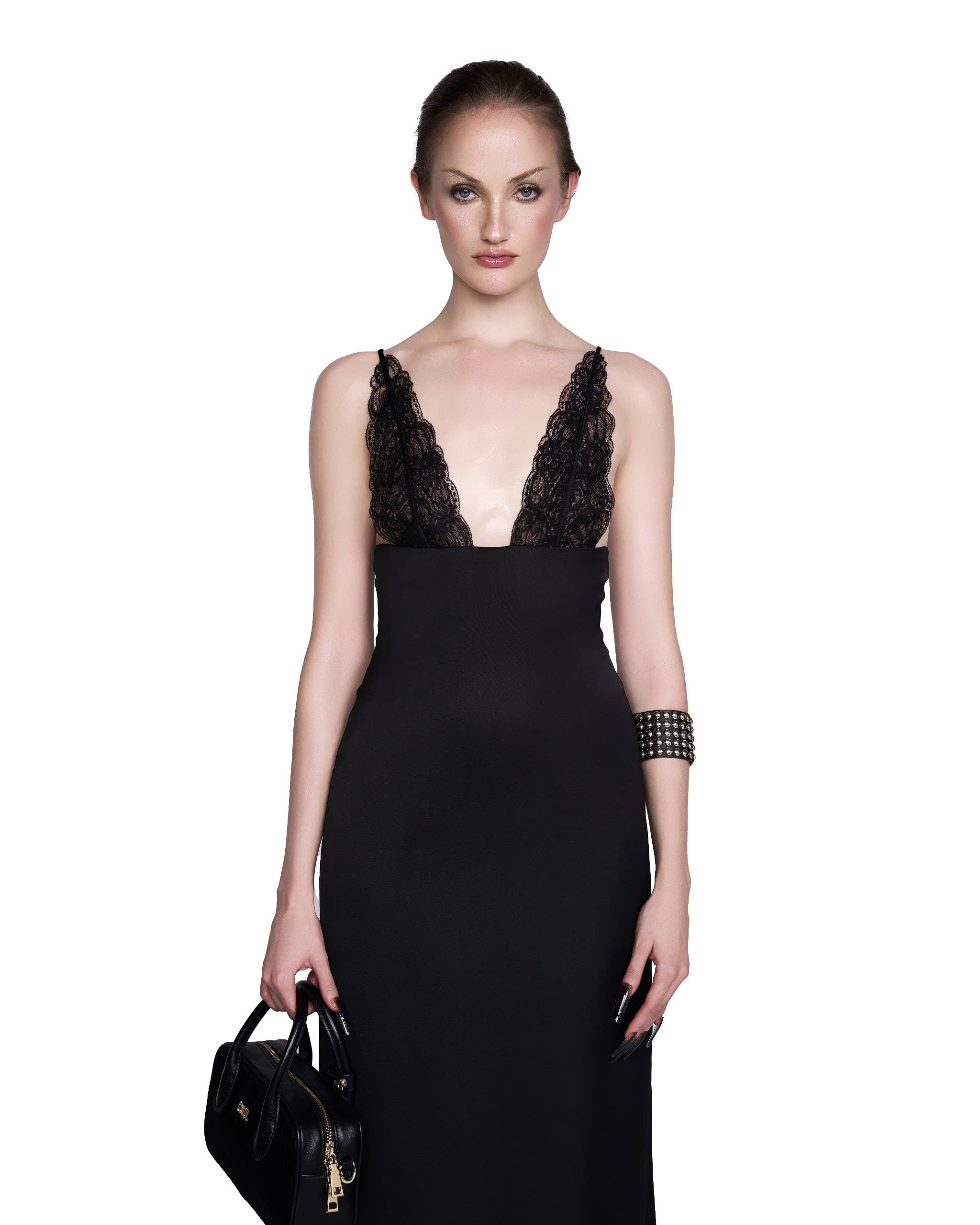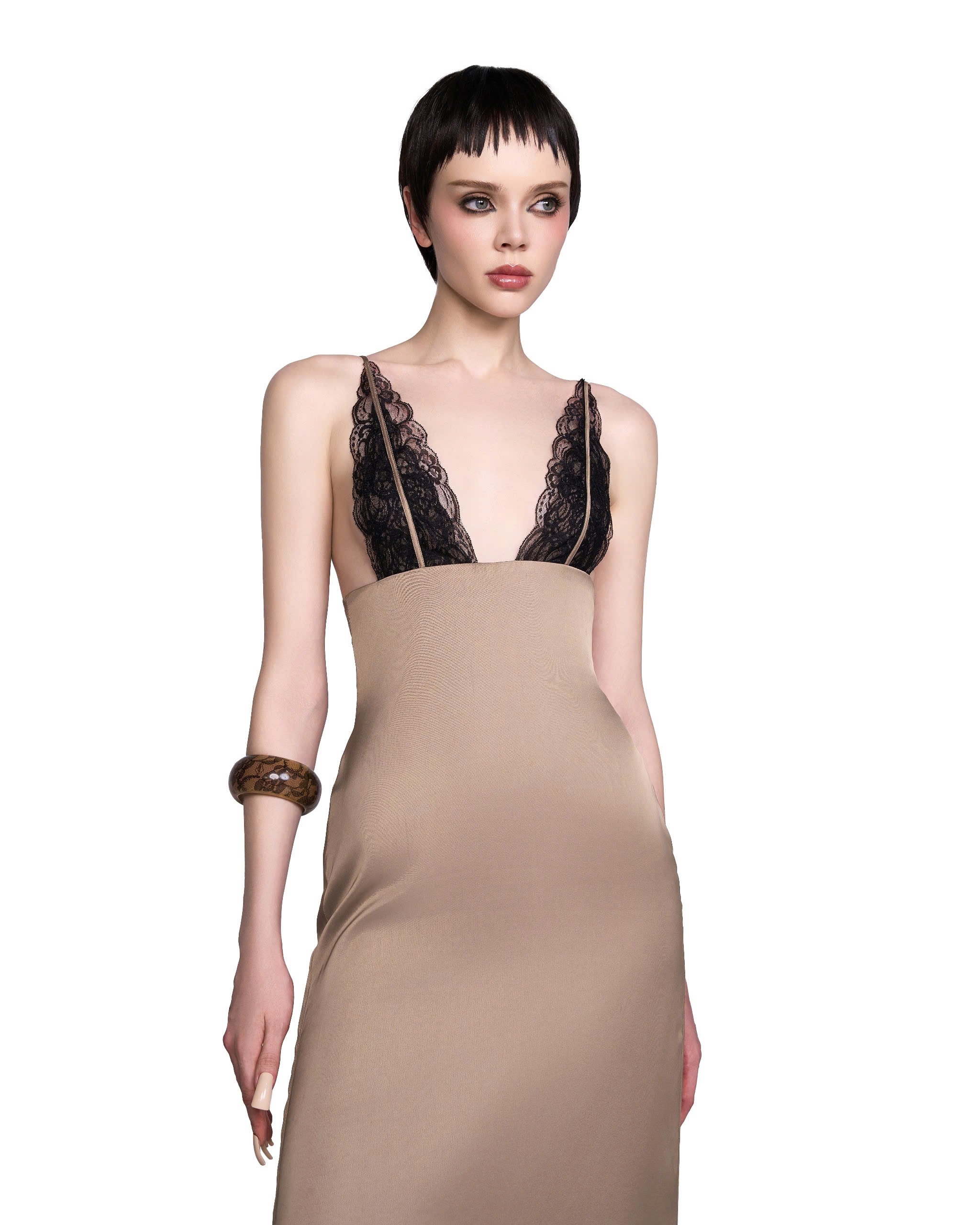 A body-hugging and straight-cut slip dress made from glossy high quality satin in black and brown.