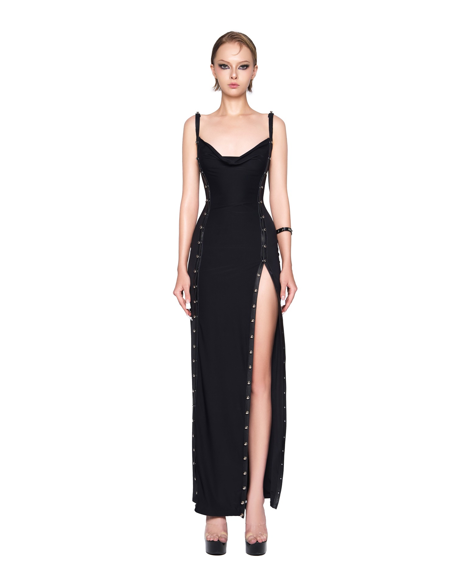 Adjustable leather straps with dome studs allow for customizable exposure.