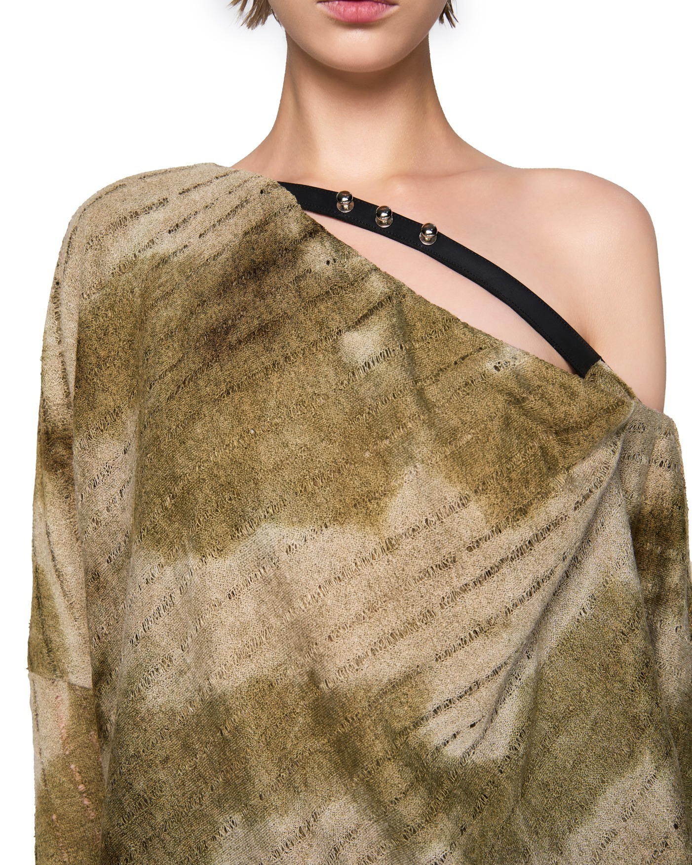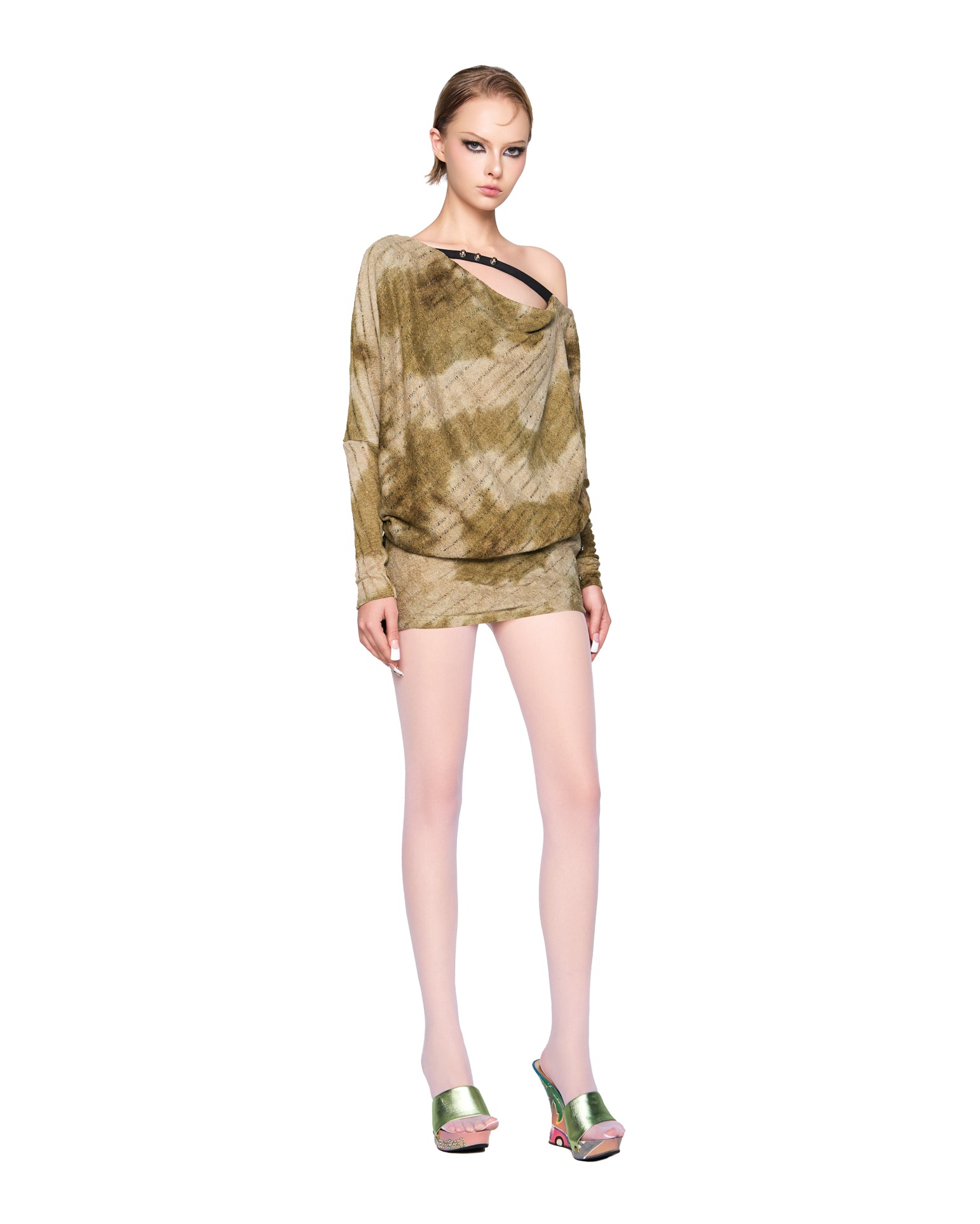 A long-sleeved off-shoulder dress featuring color bleeding on a light green fabric base.