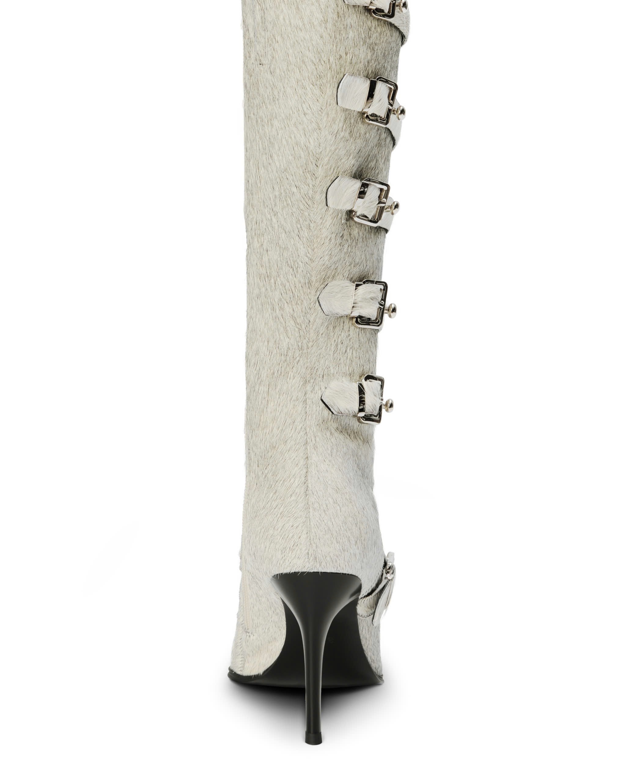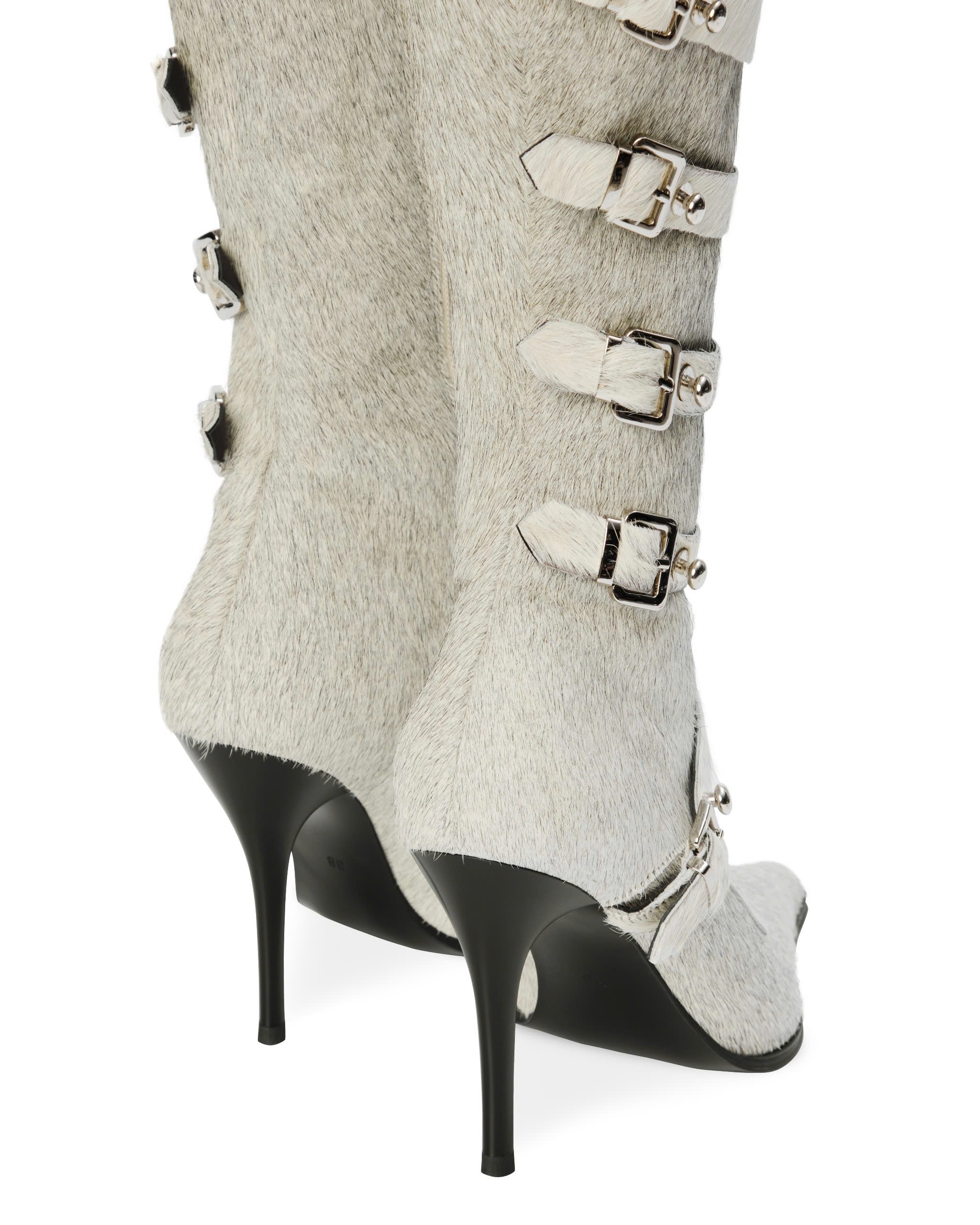 Leather straps adorned with metal studs and buckle running along the shoe shaft.