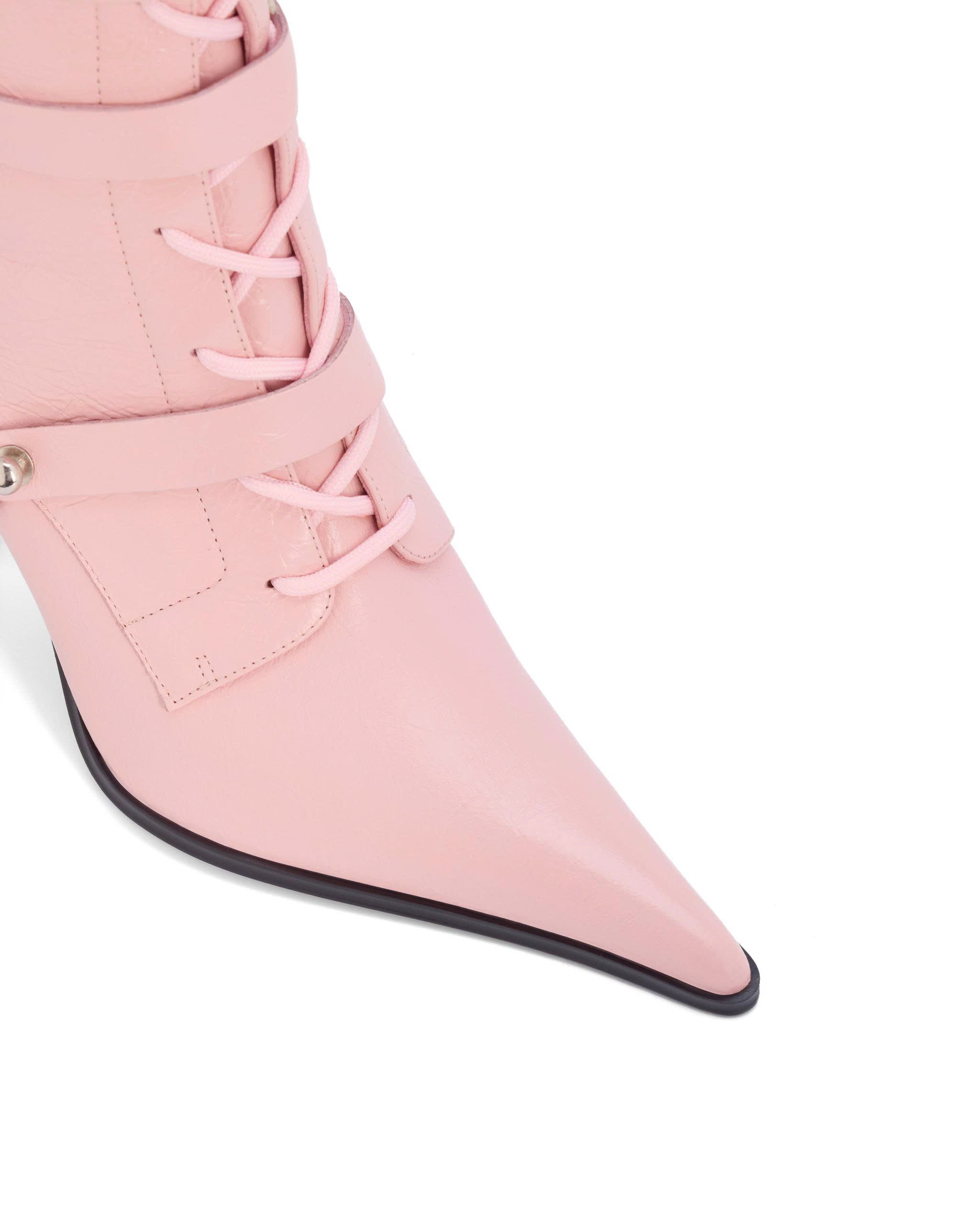 Calf-high shaft, featuring front lace-up detailing and a side metal zipper.