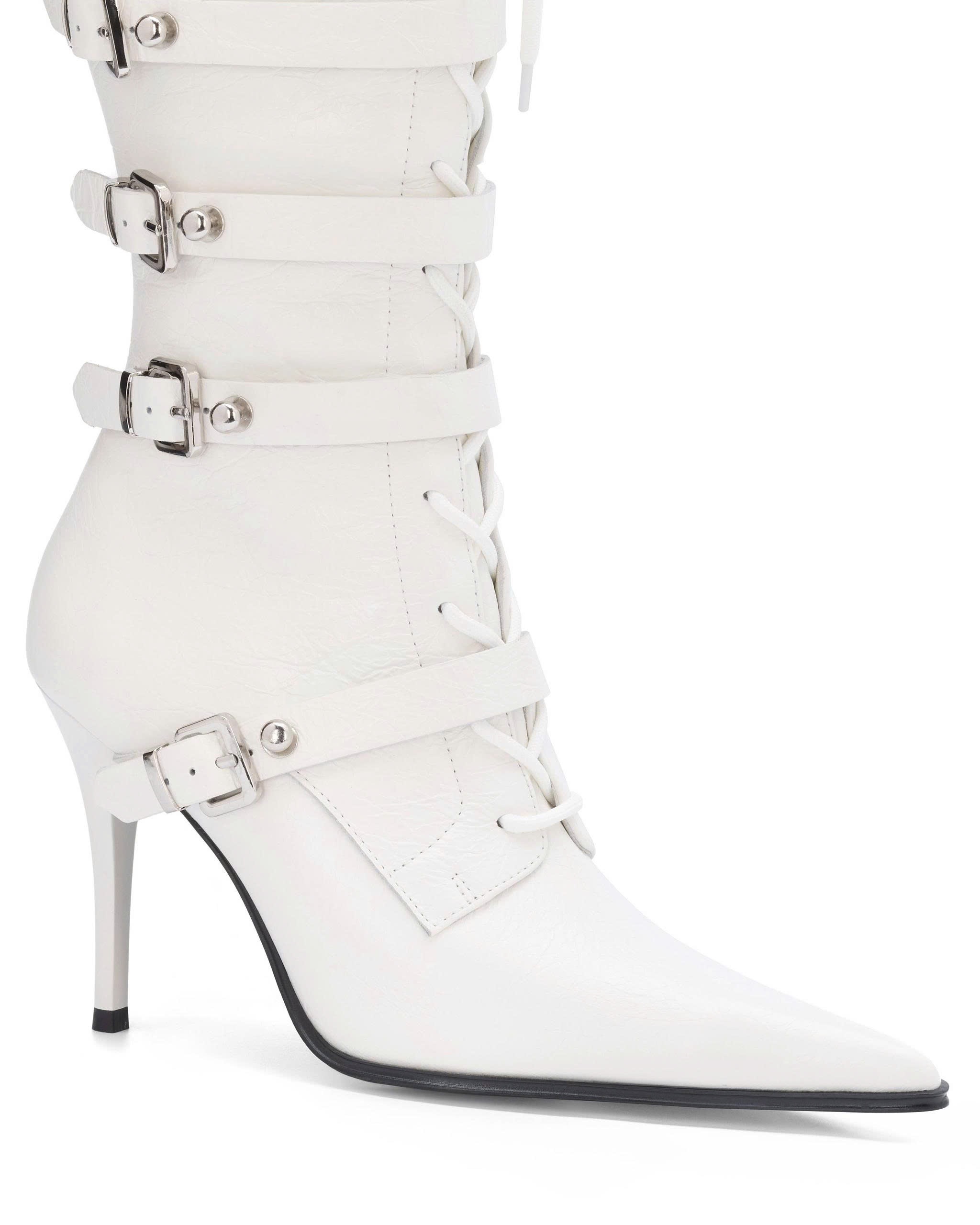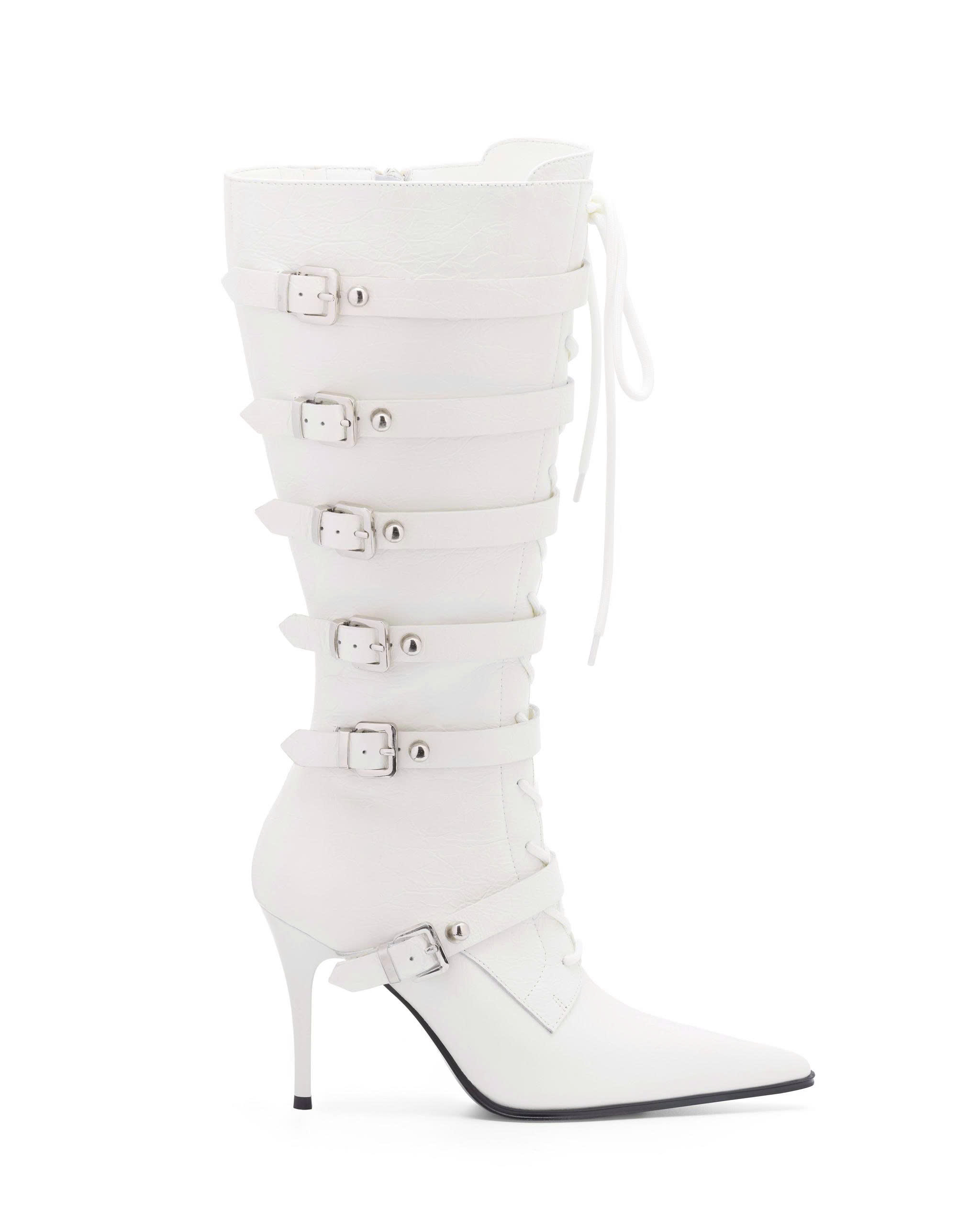 Leather straps adorned with metal studs and buckle running along the shoe shaft.