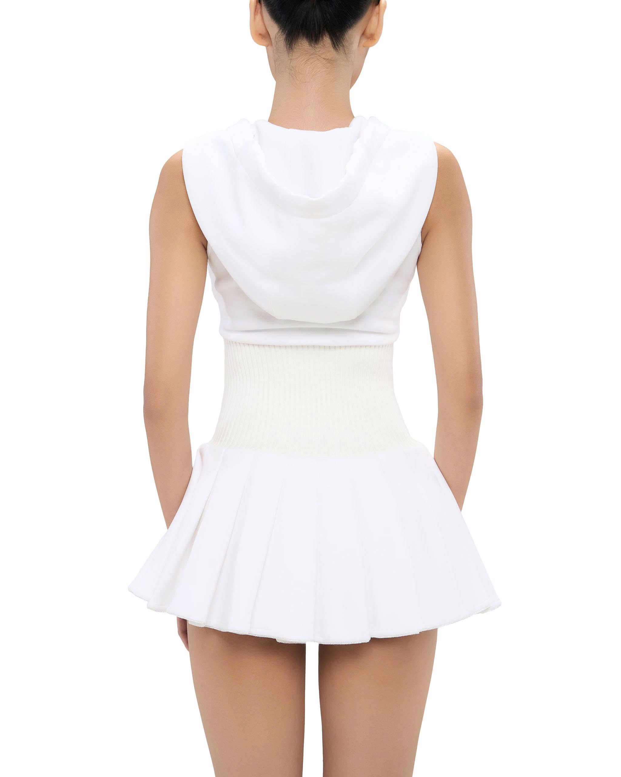 Wide ribbed waistband. Soft pleated hem.
