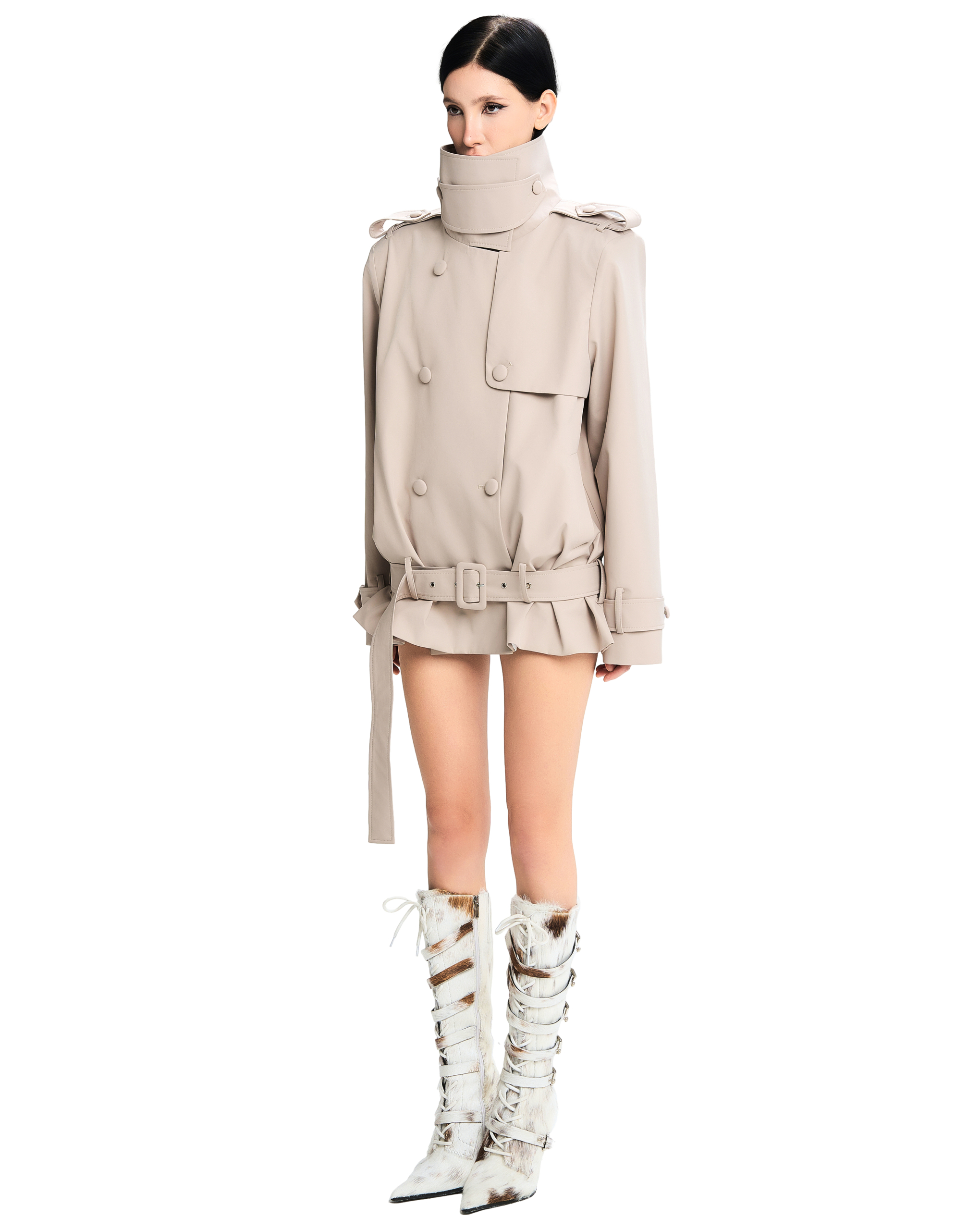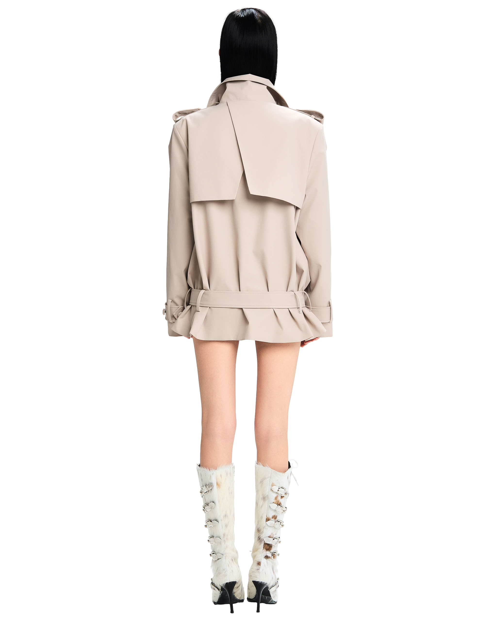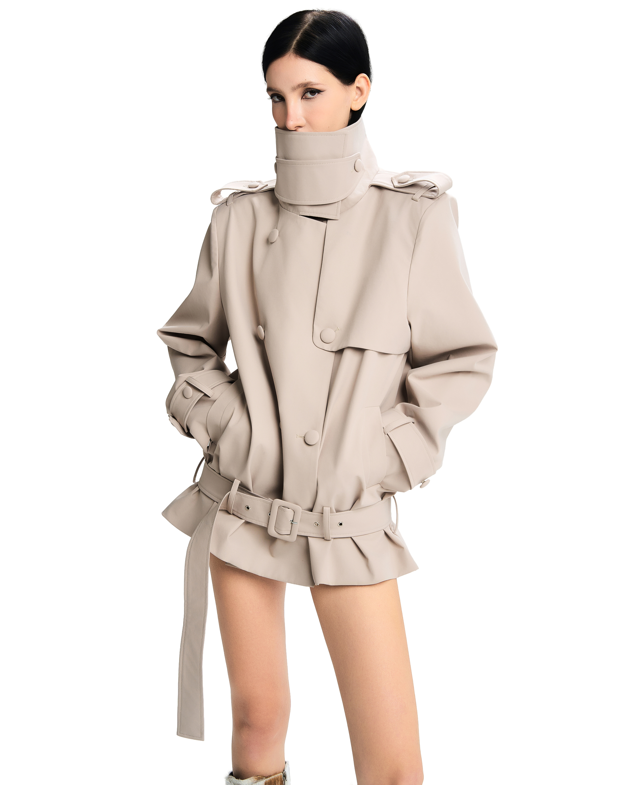 Adjustable wide belt at the waist and cuffs.