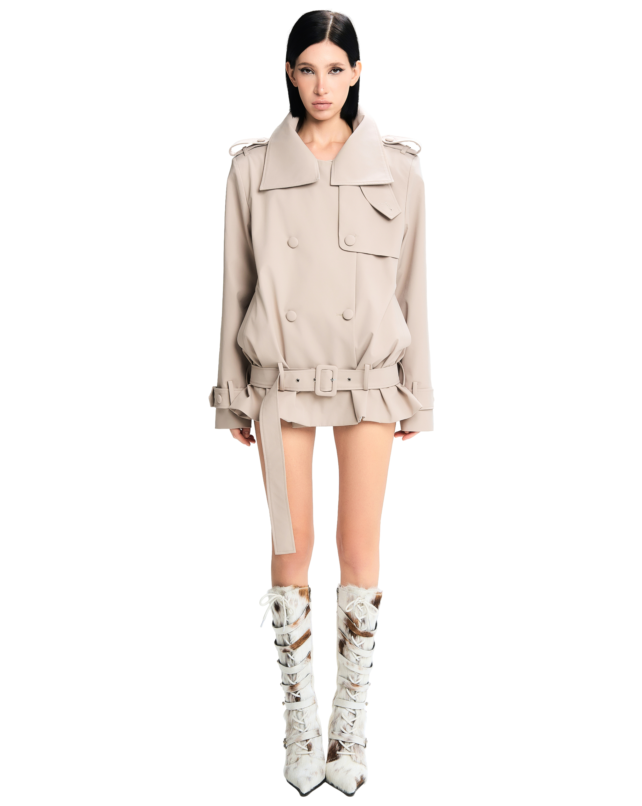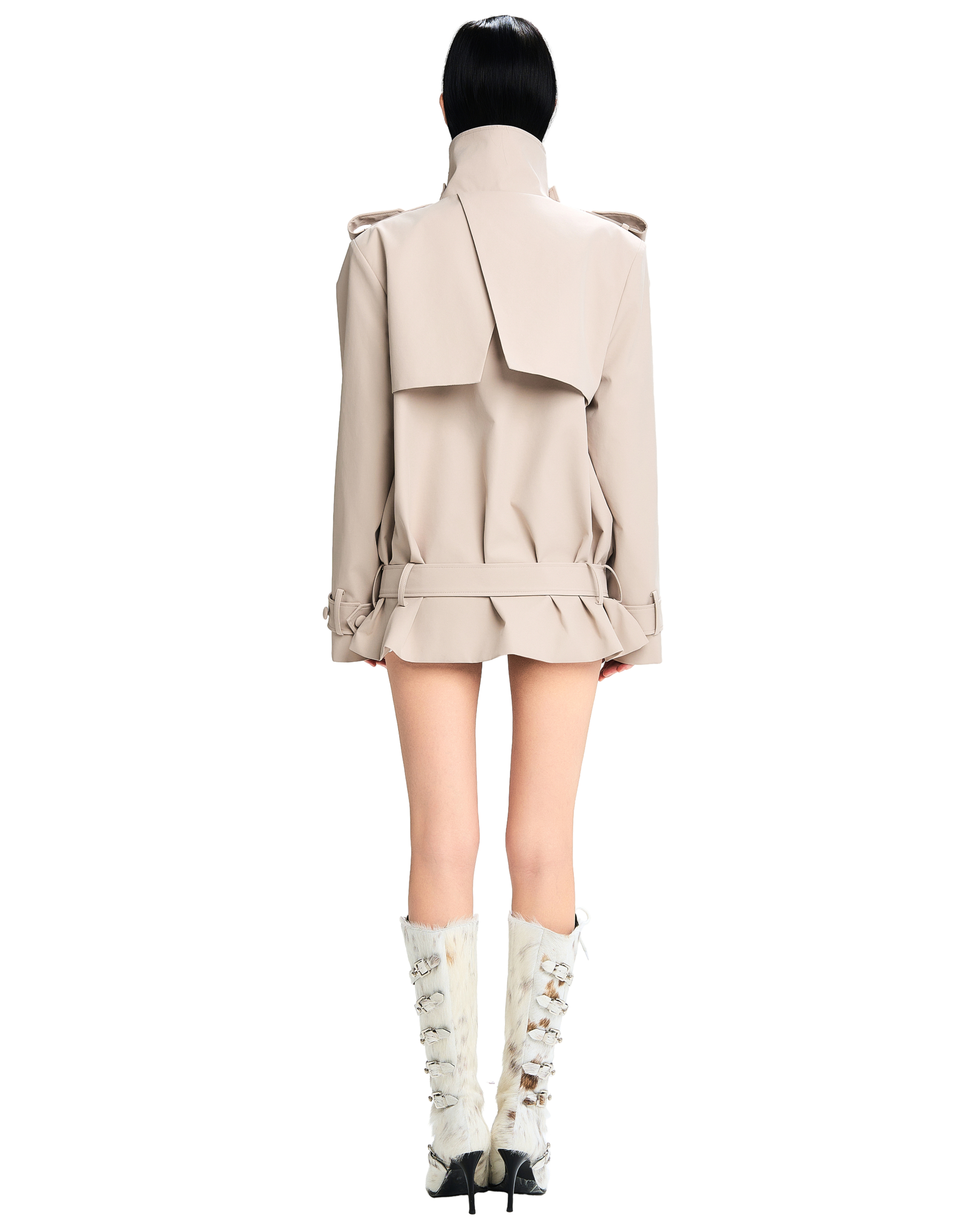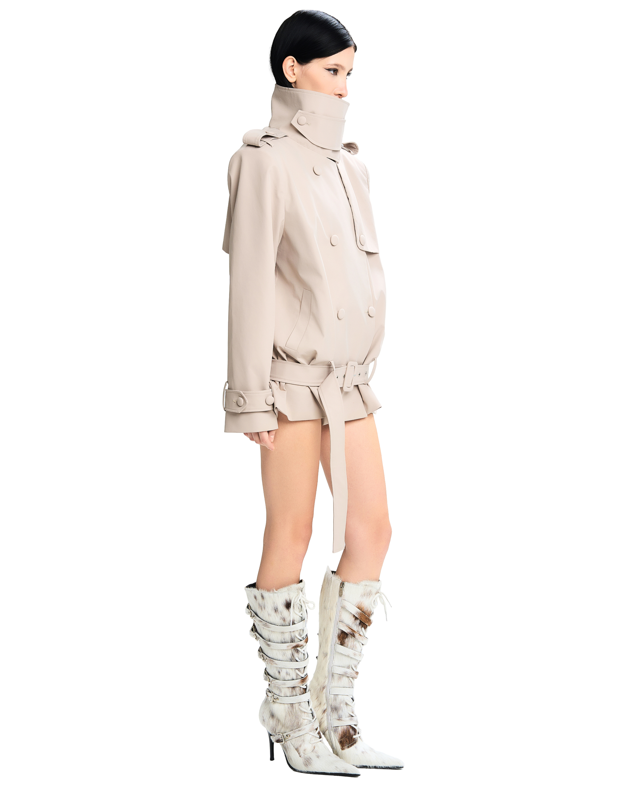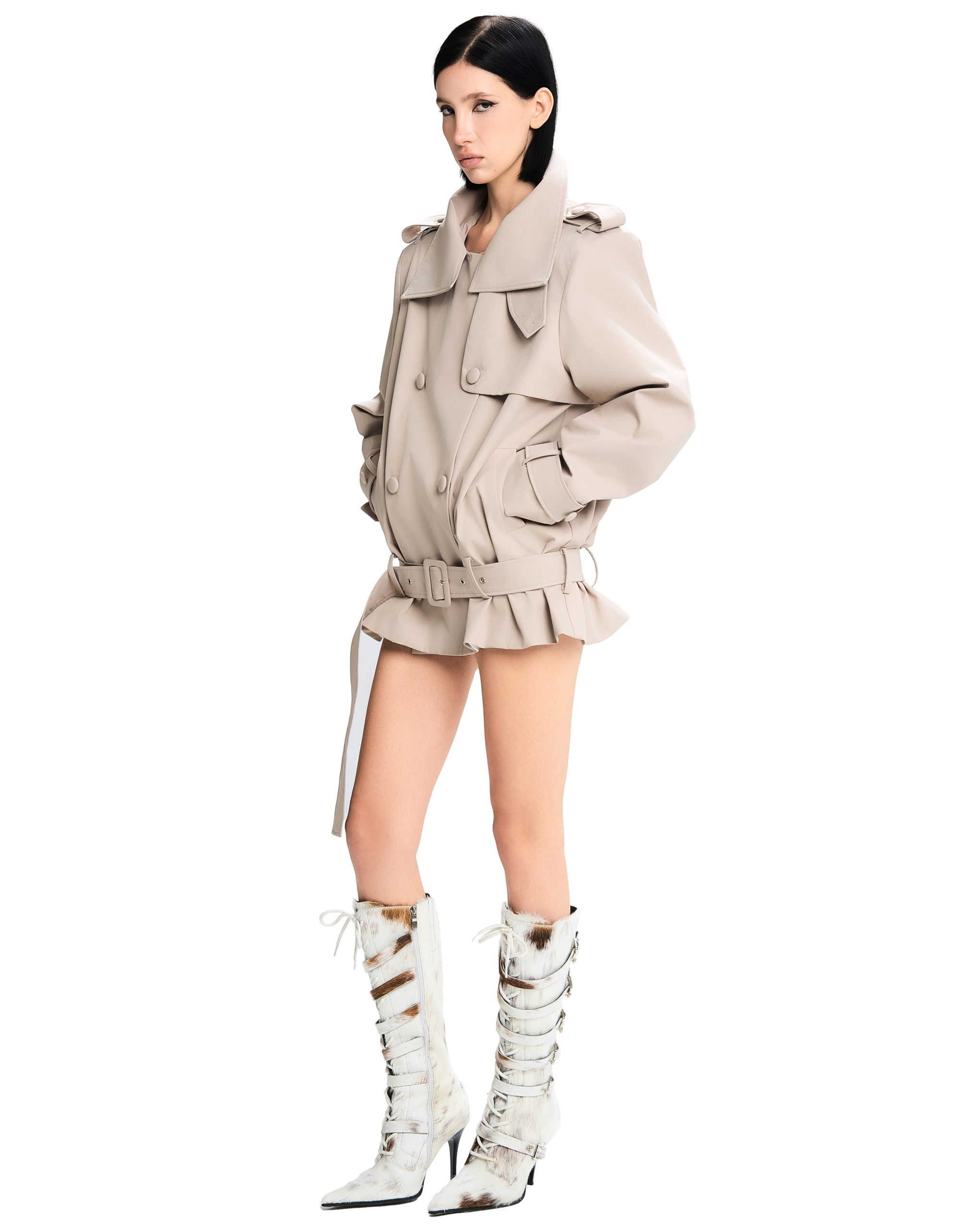 Adjustable wide belt at the waist and cuffs.