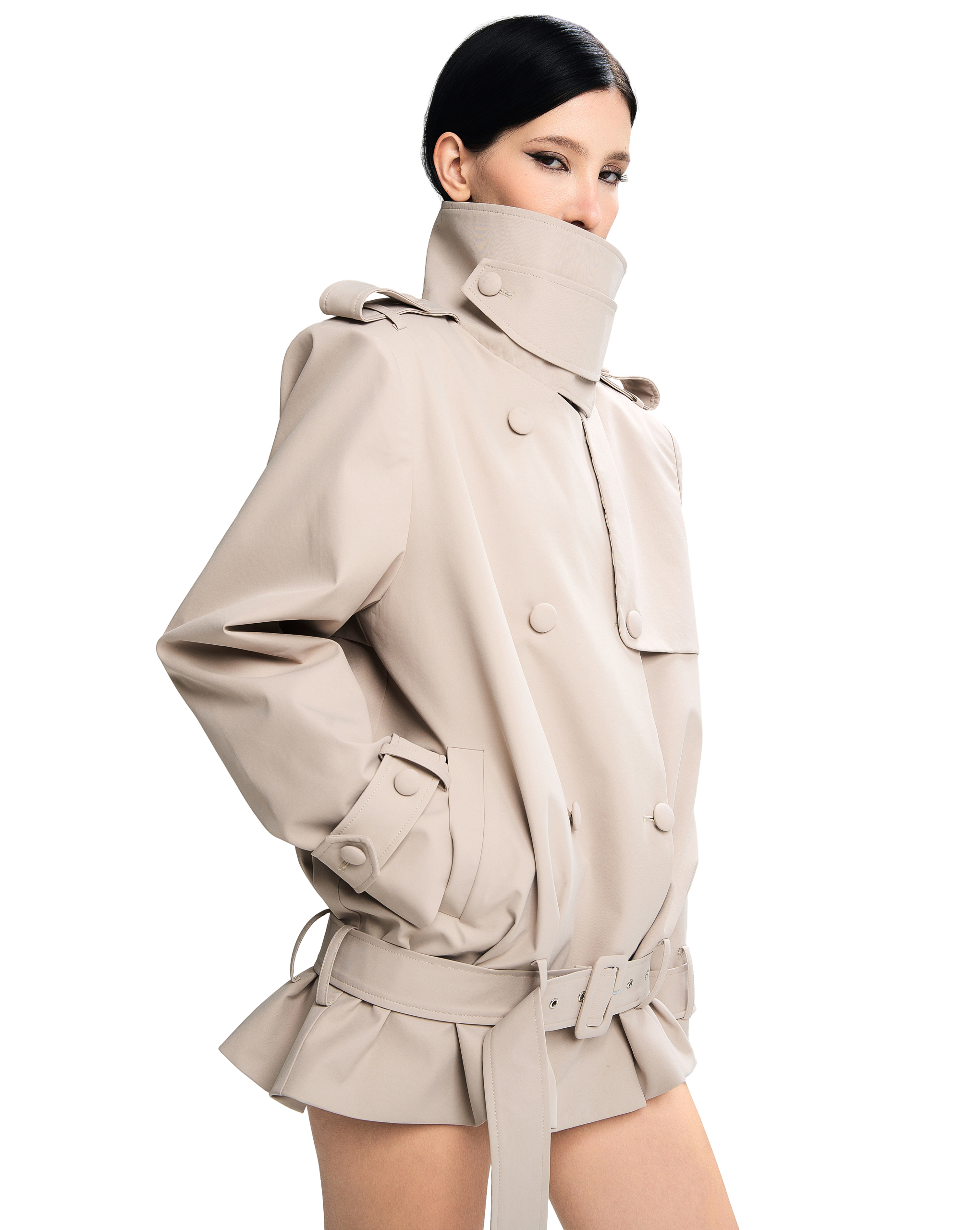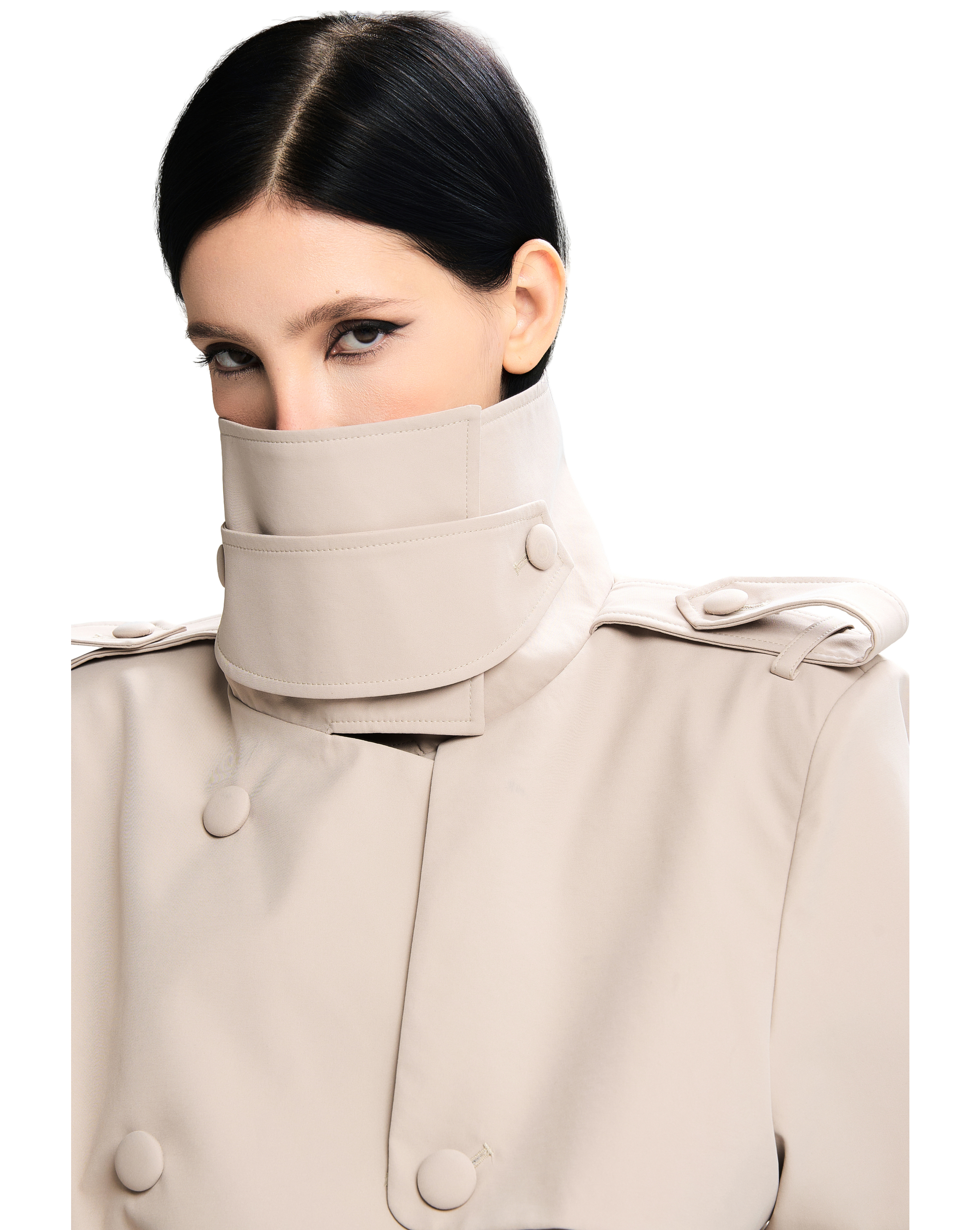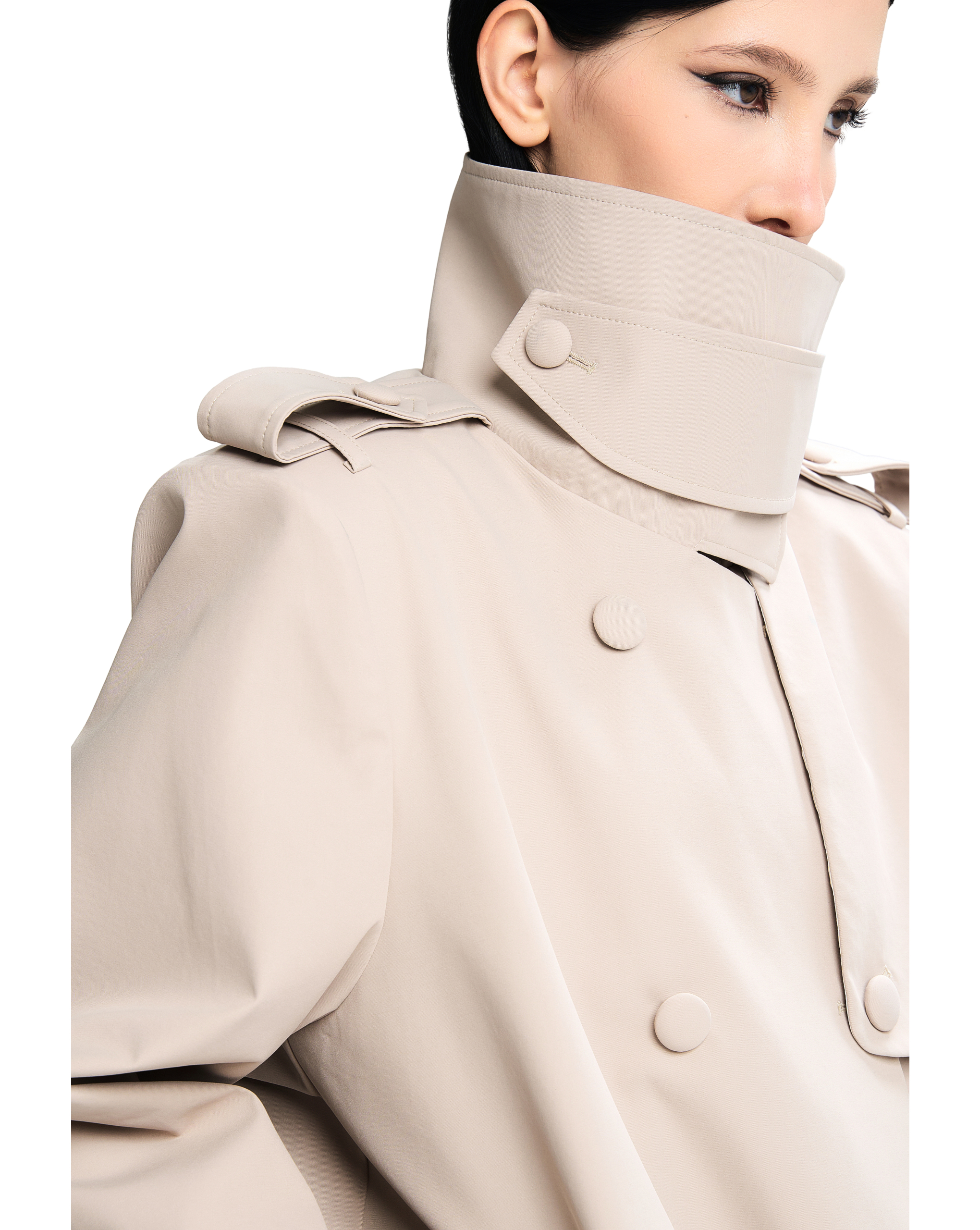Structured wide collar with button detail โ€” can be worn upright or folded down.