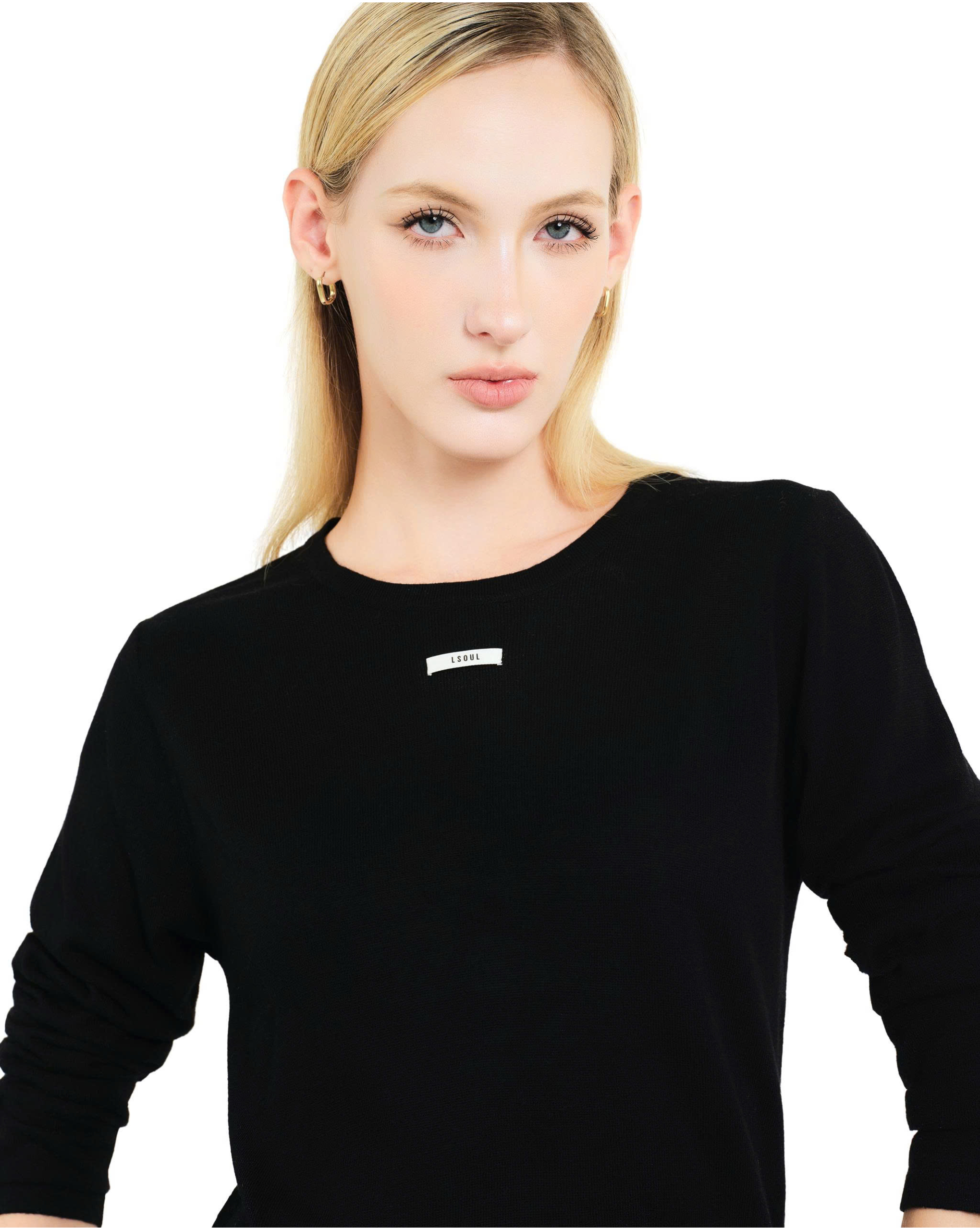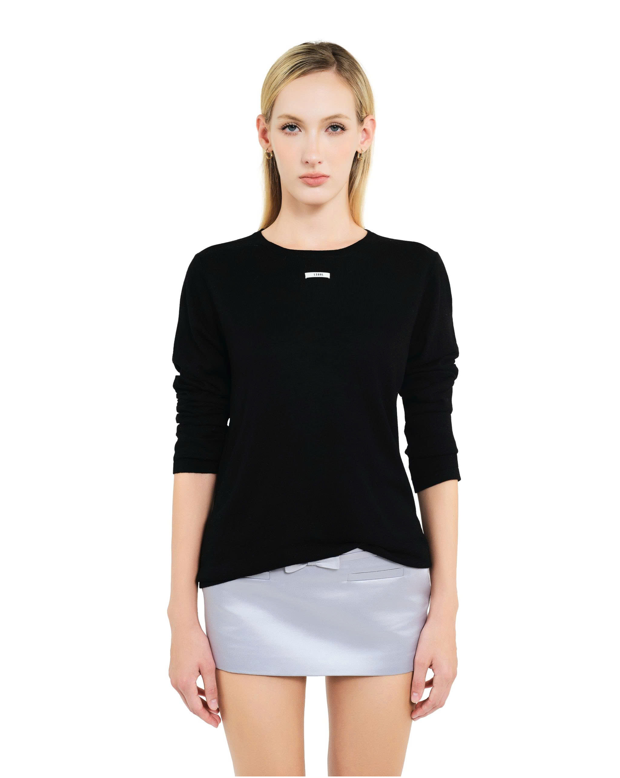 Long sleeves, round neckline, tonal logo beneath the collar.