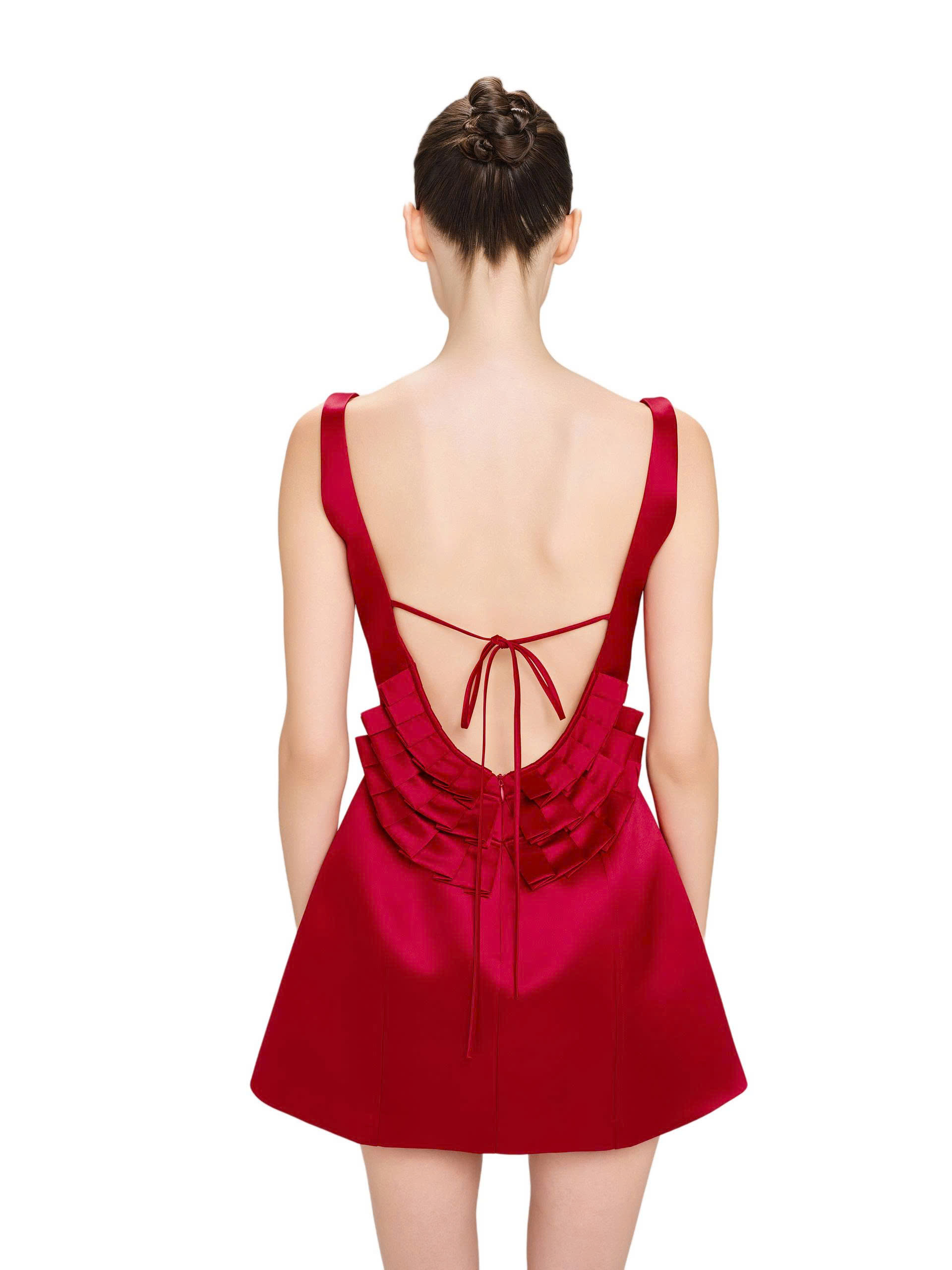 Phía sau hở lưng, thắt eo sau đính chi tiết xếp tầng.