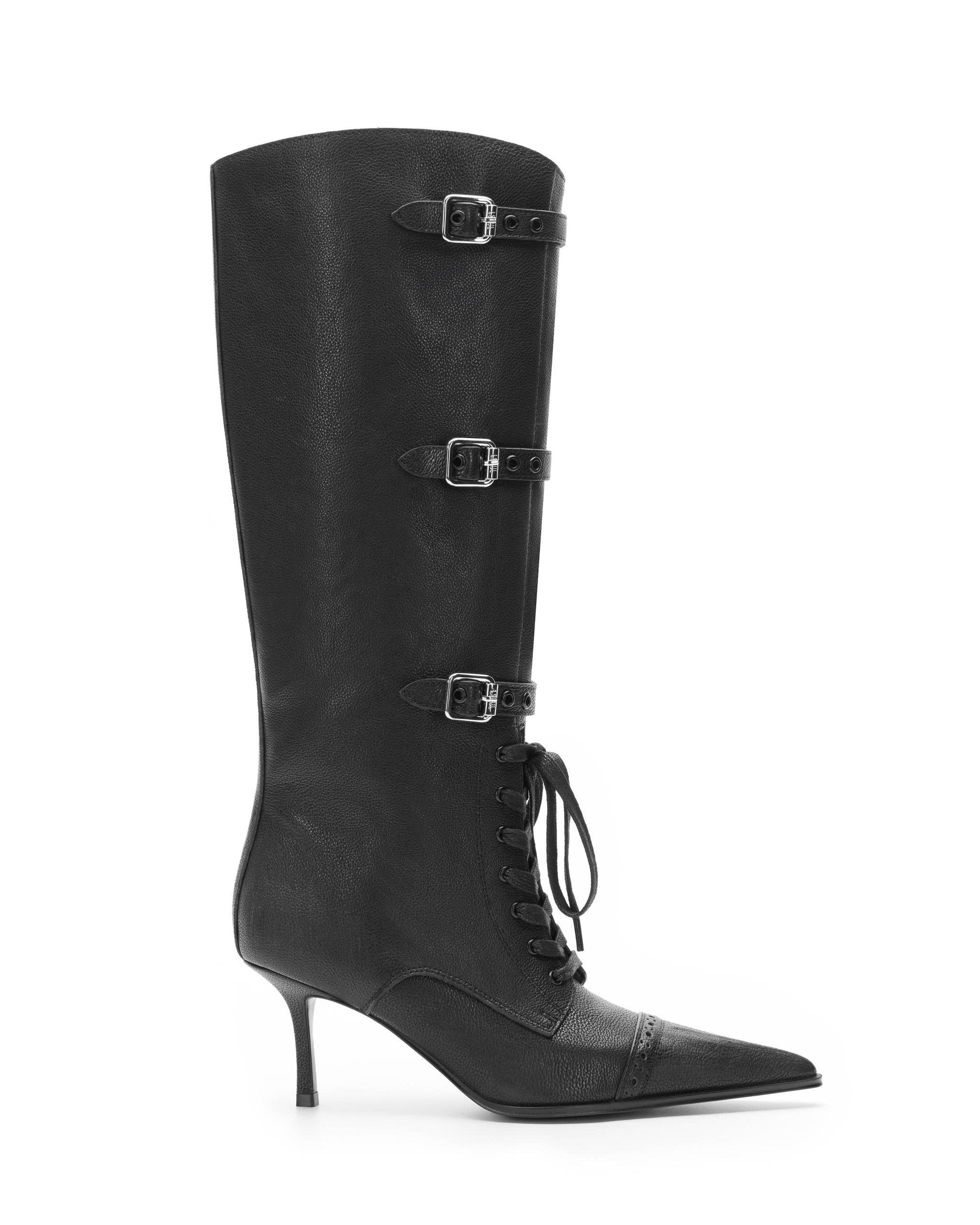 Vòng dây bản nhỏ và nút cài kim loại dọc thân giày.