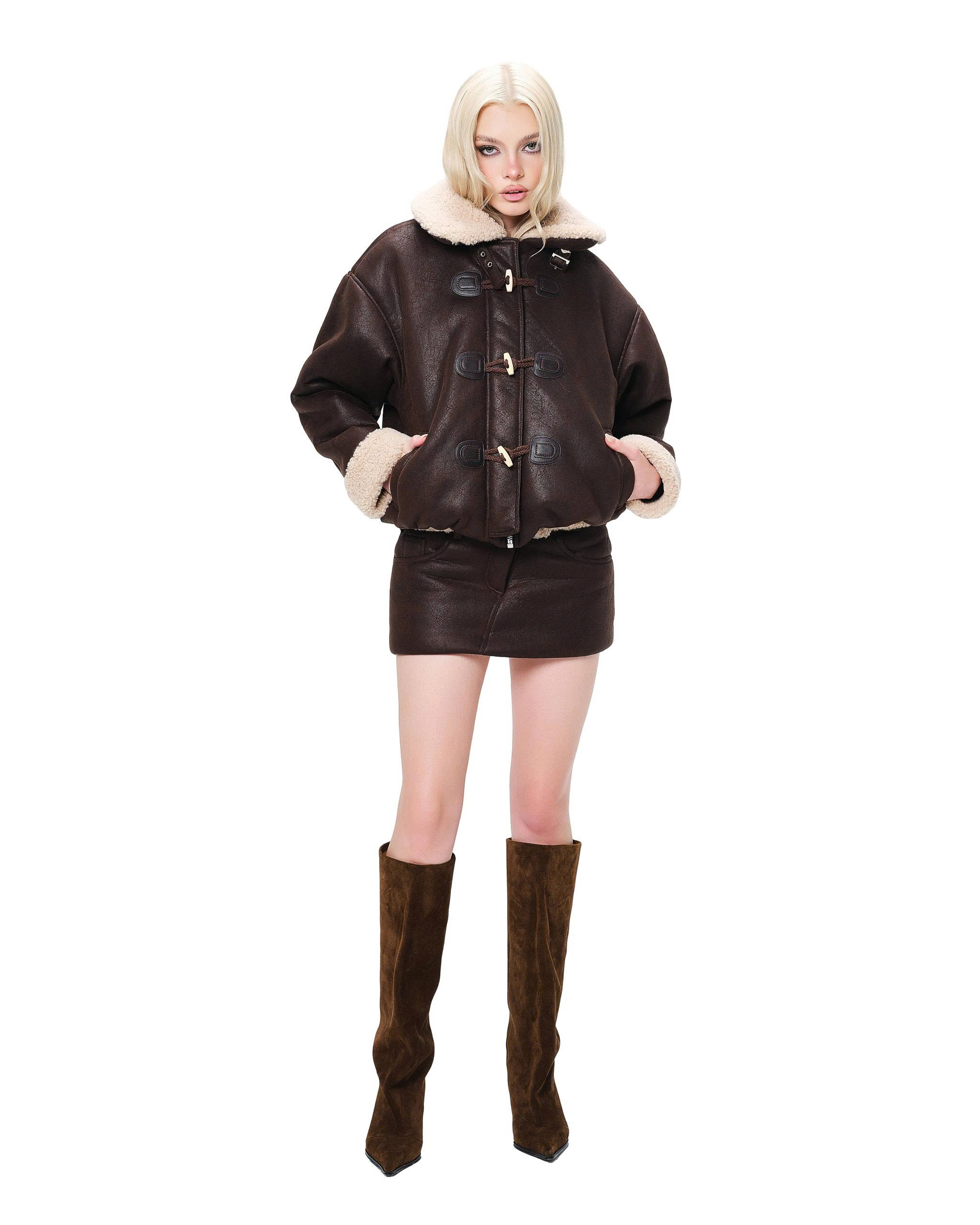 Chân váy mini lưng thun và dây rút.