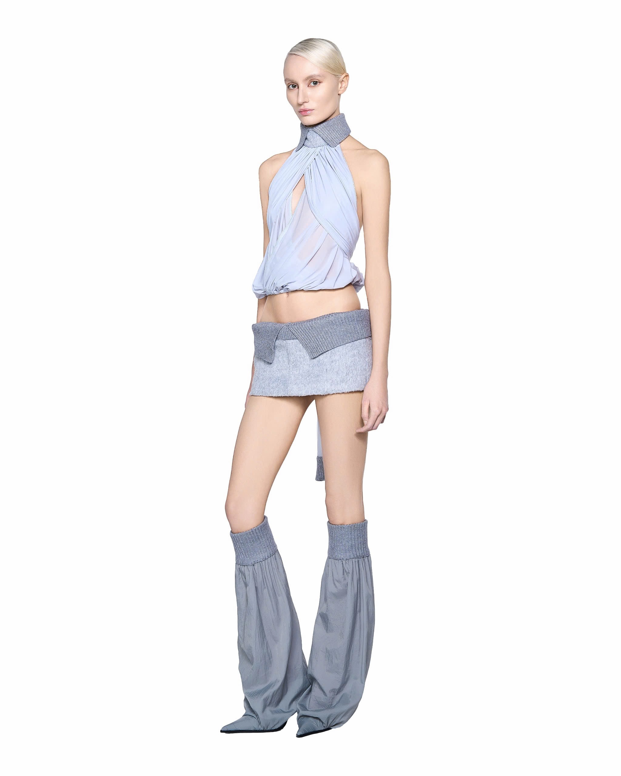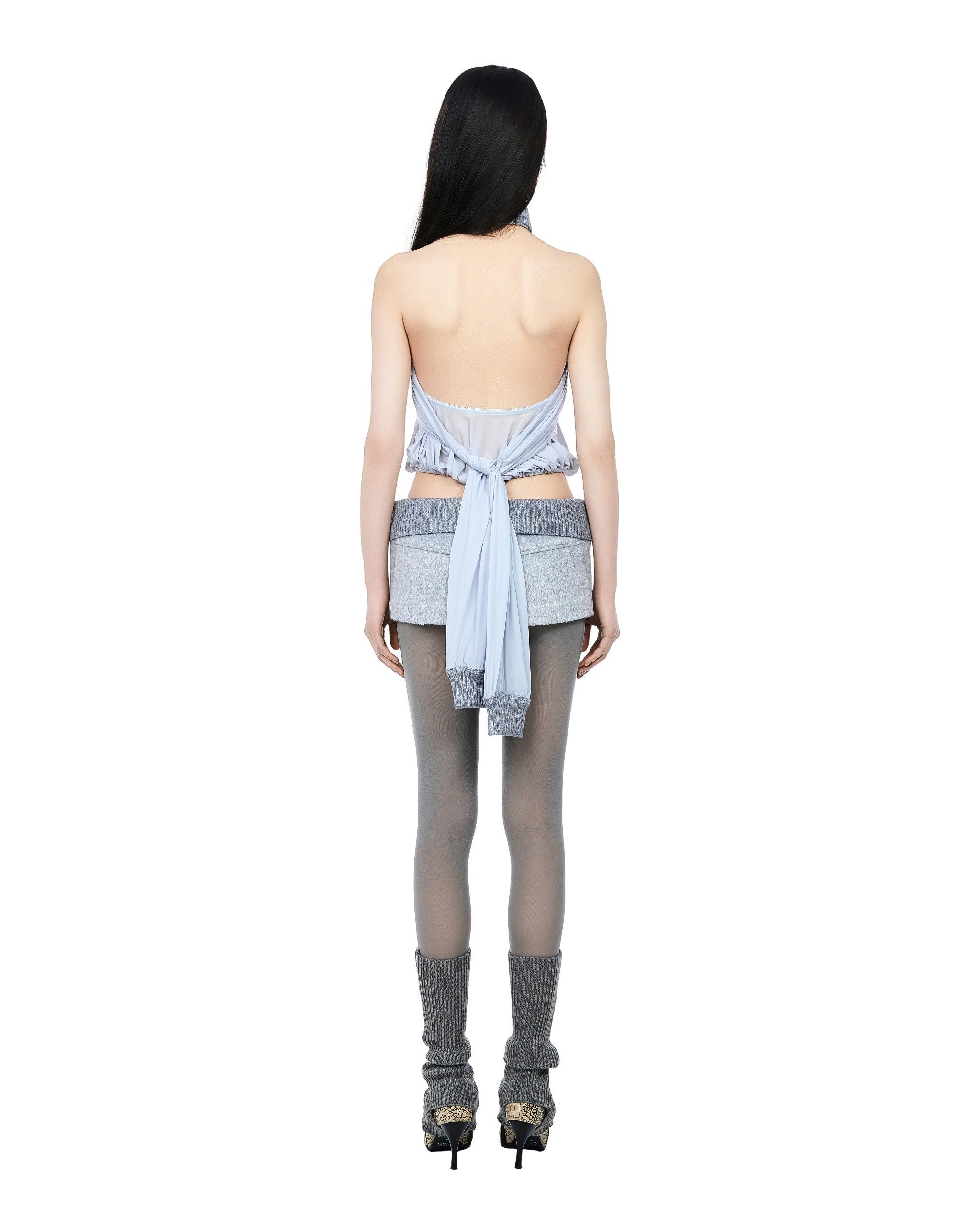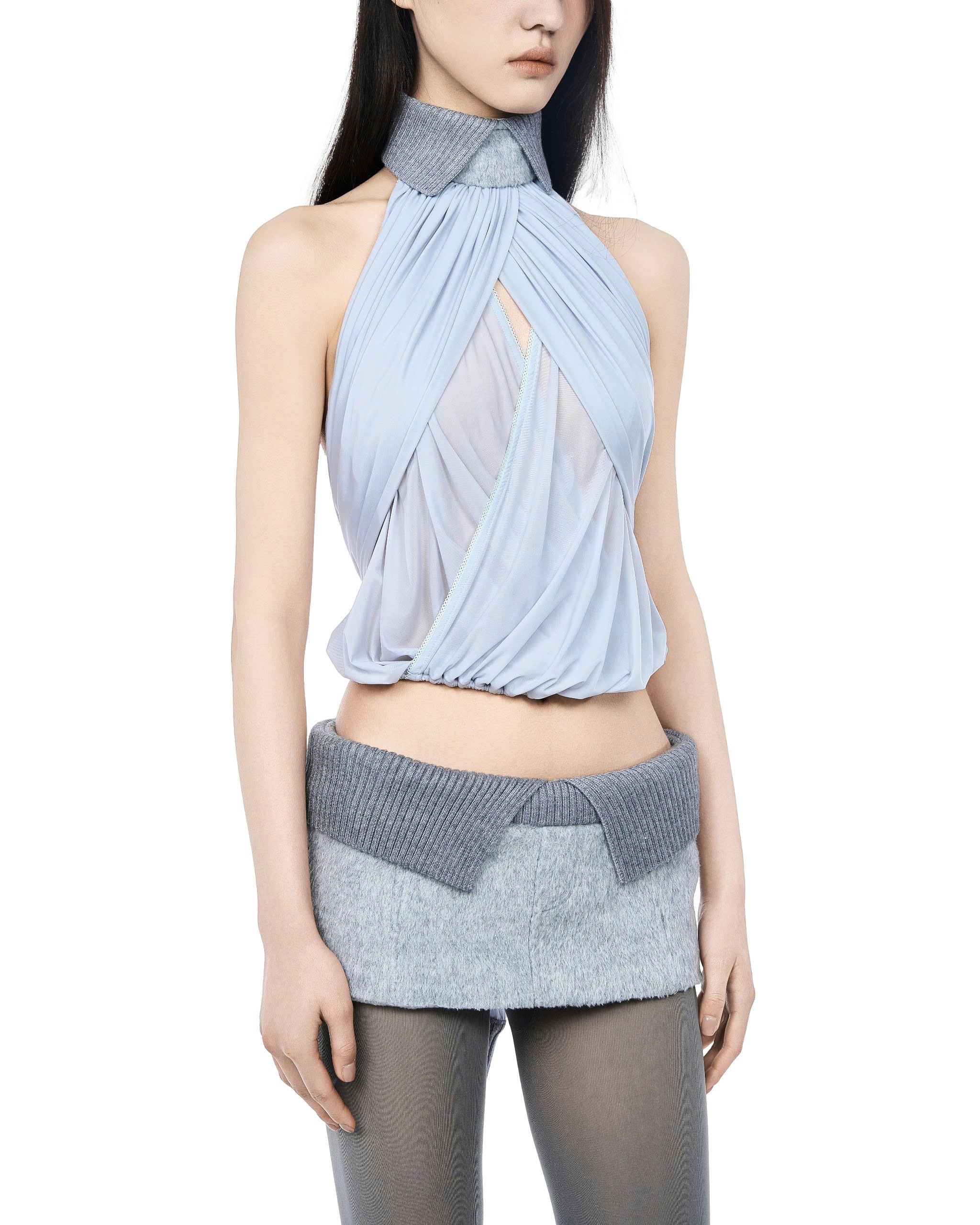 Thiết kế vạt chéo hai lớp bằng vải bán xuyên thấu, dây thắt phía sau.