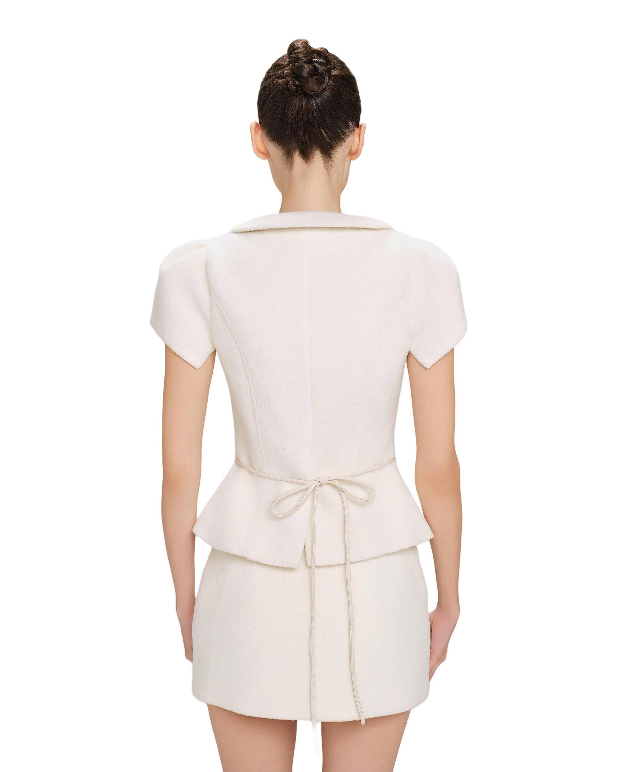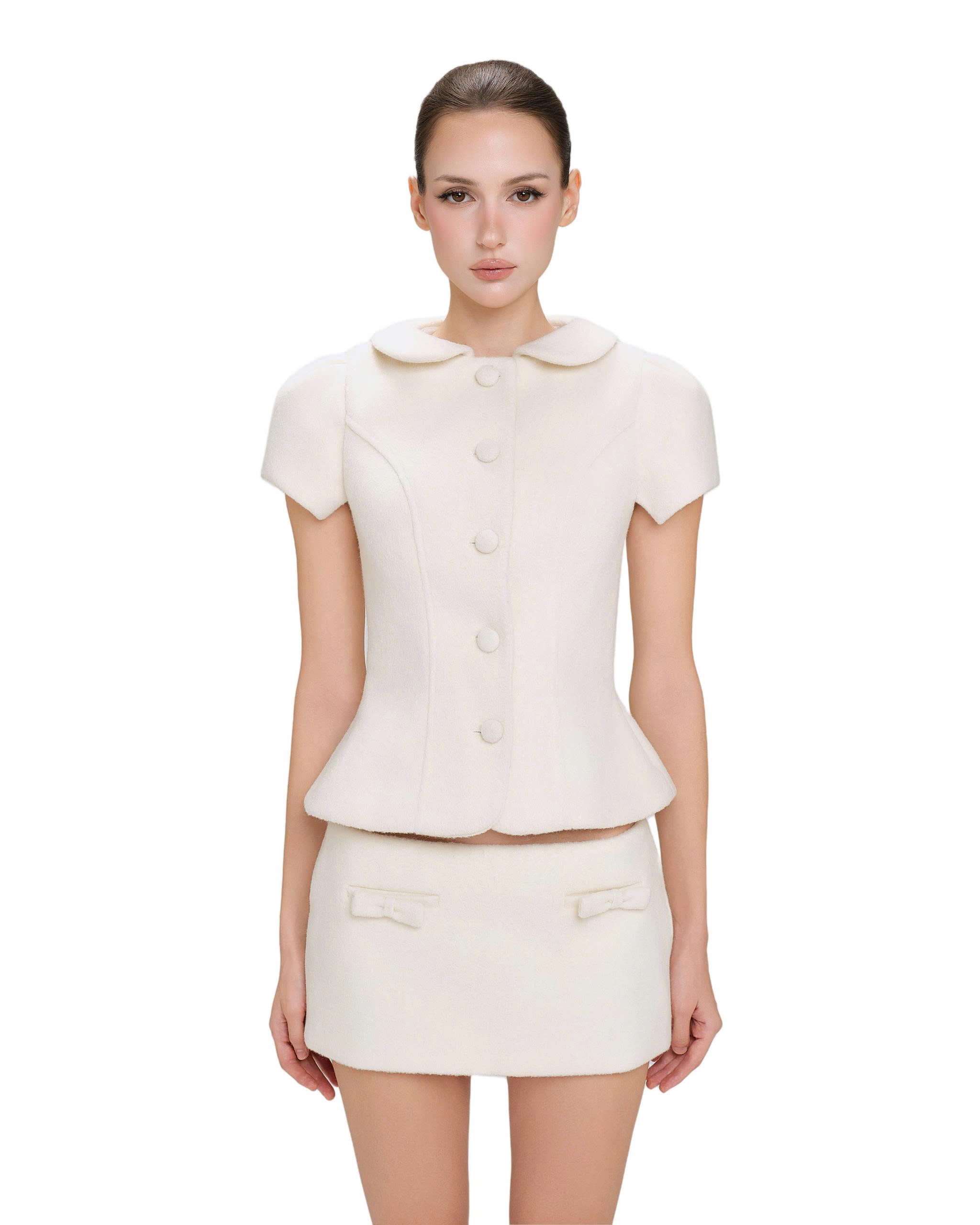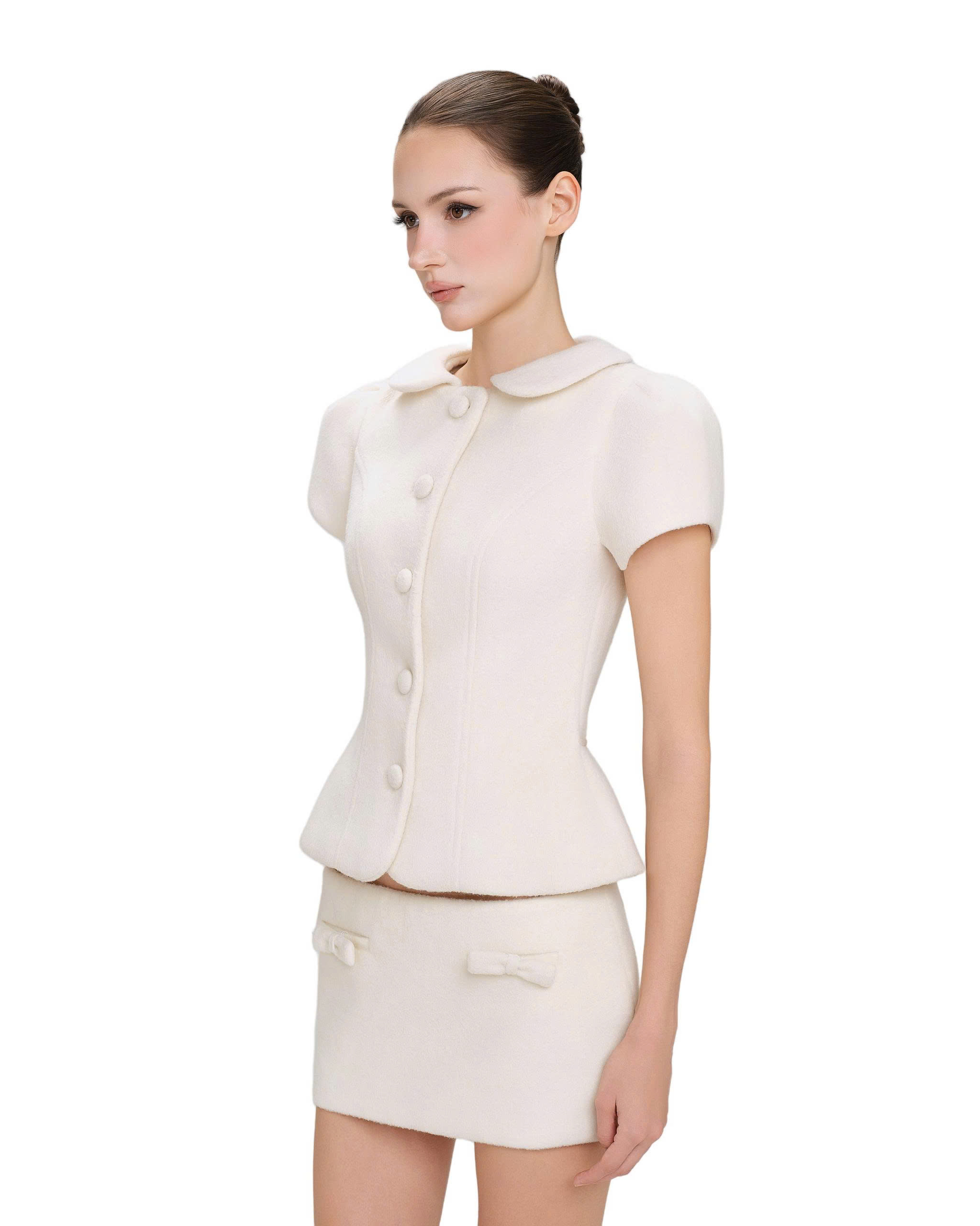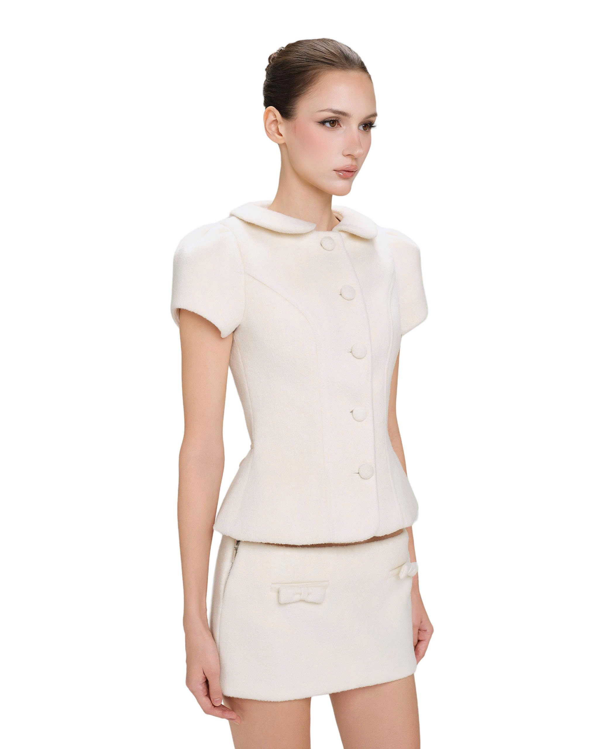 Chân váy mini, ôm dáng, dây kéo bên hông phải.