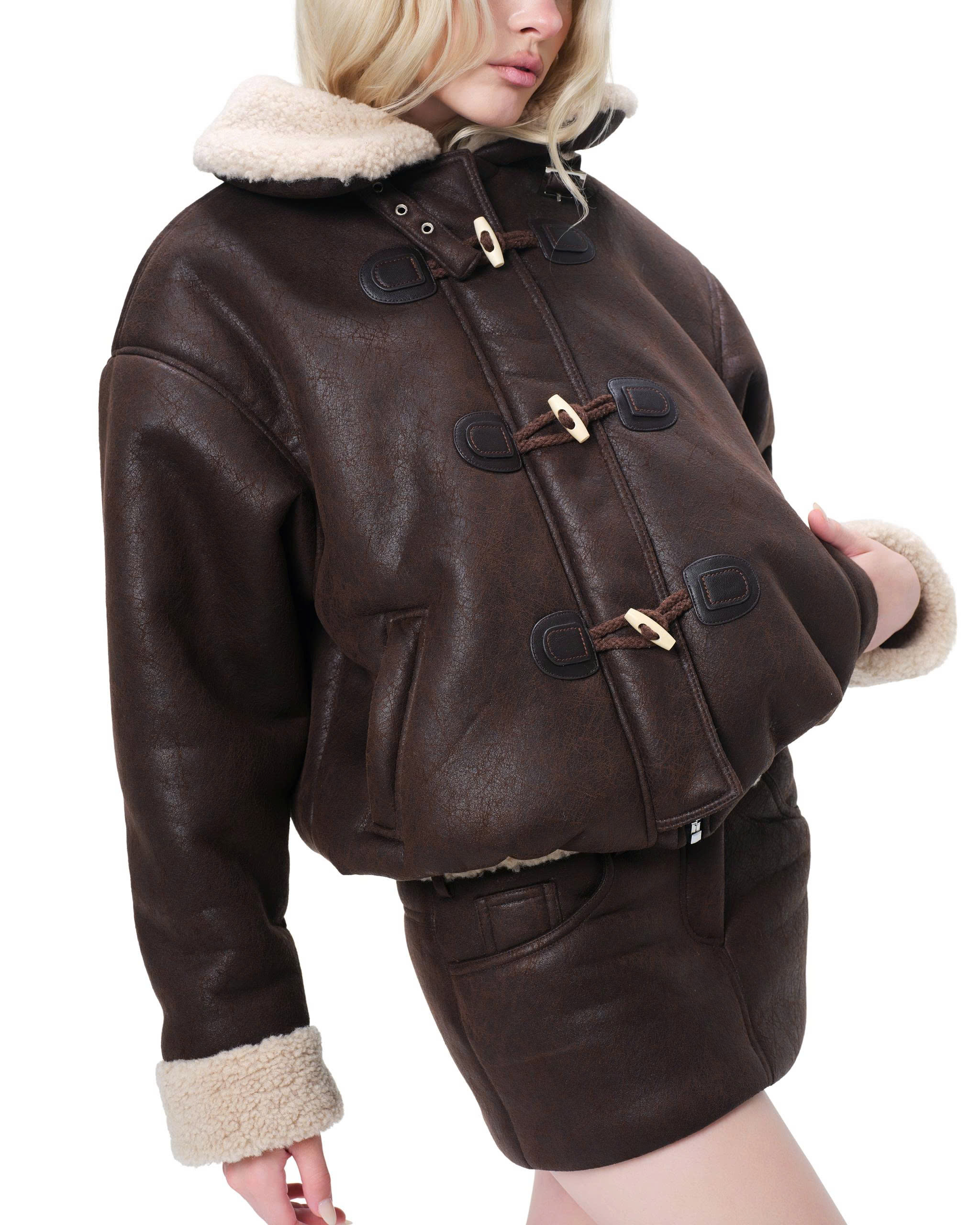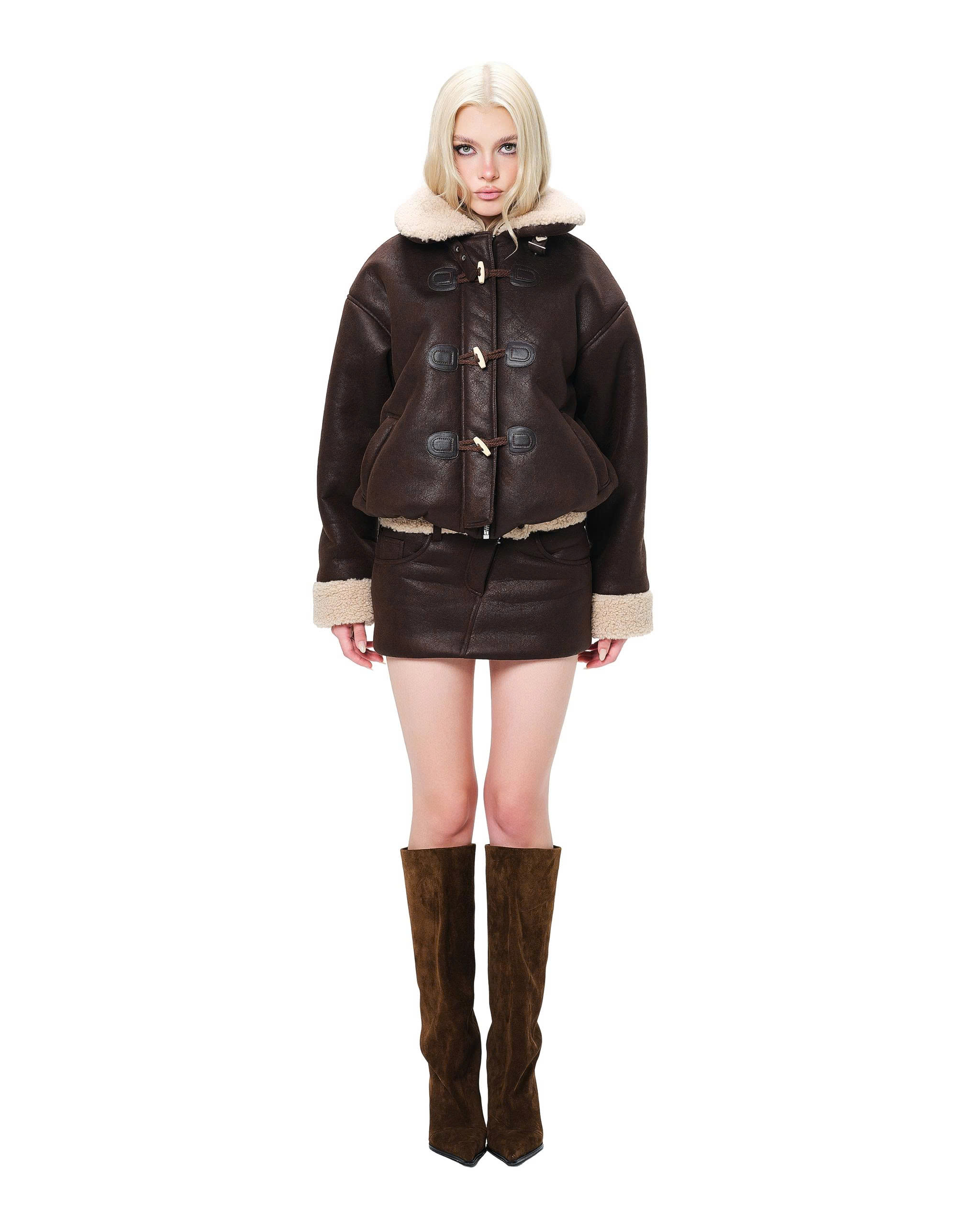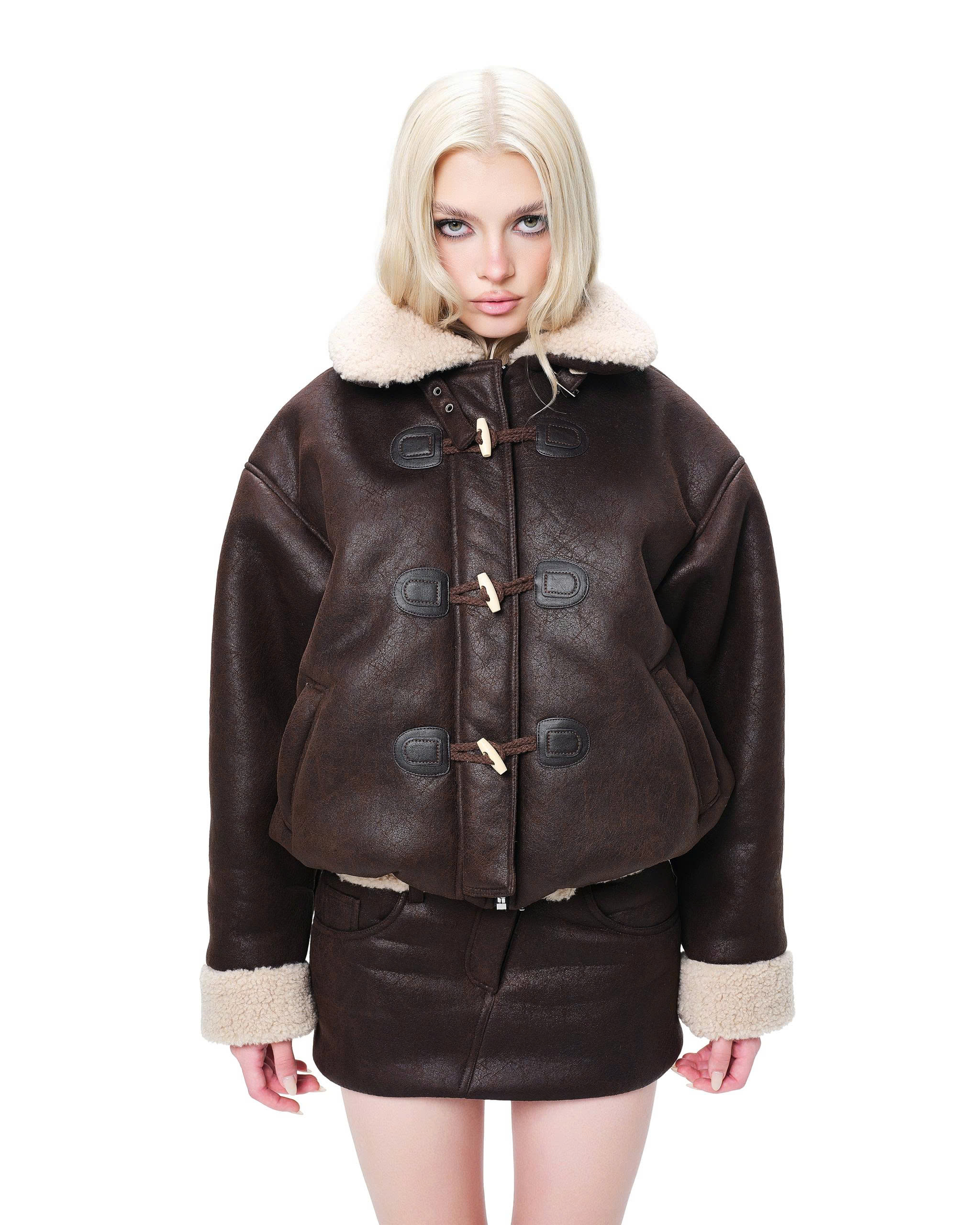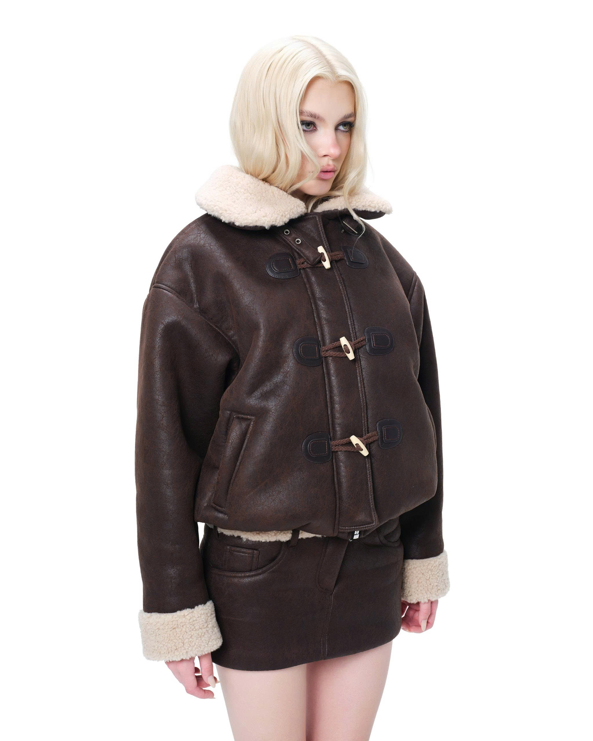 Fur-trimmed collar and cuffs.
