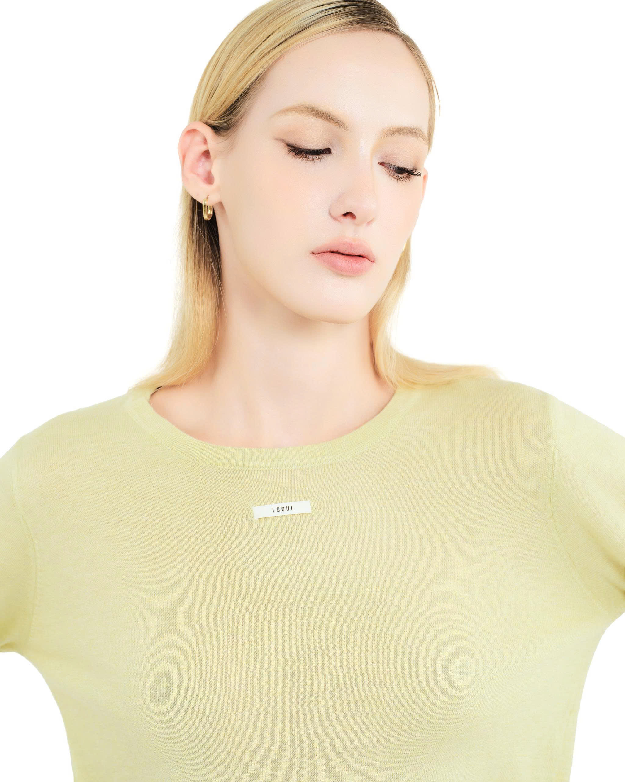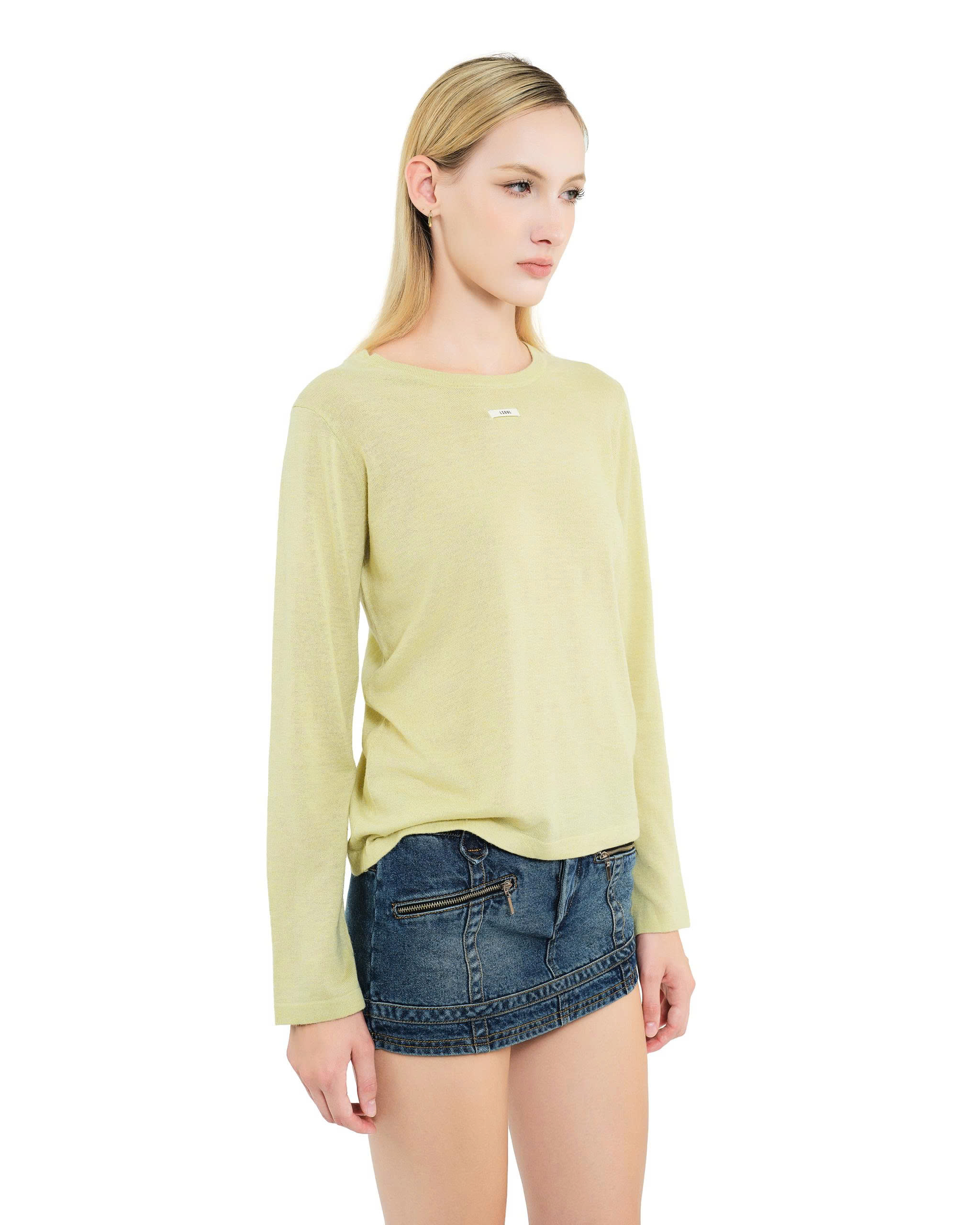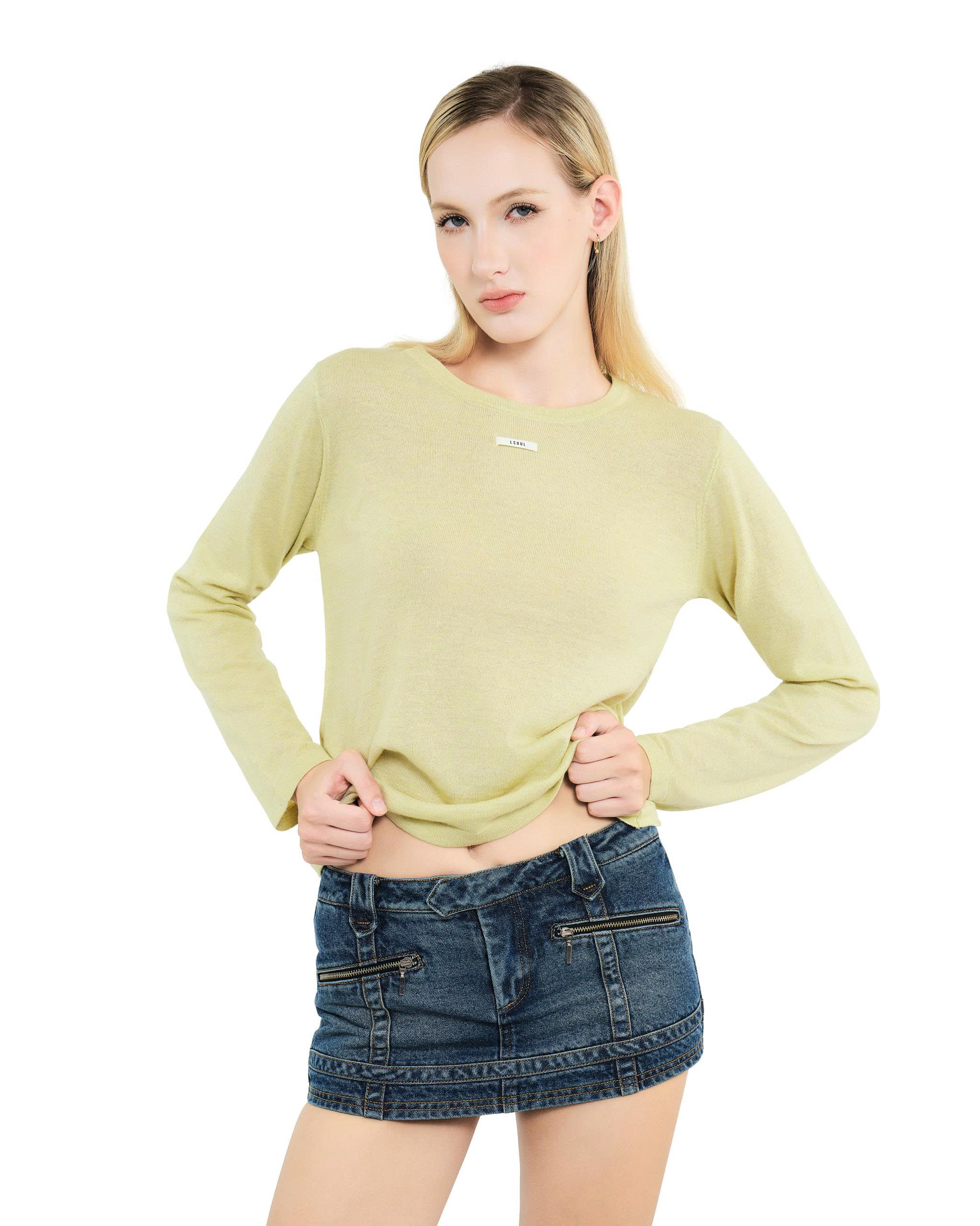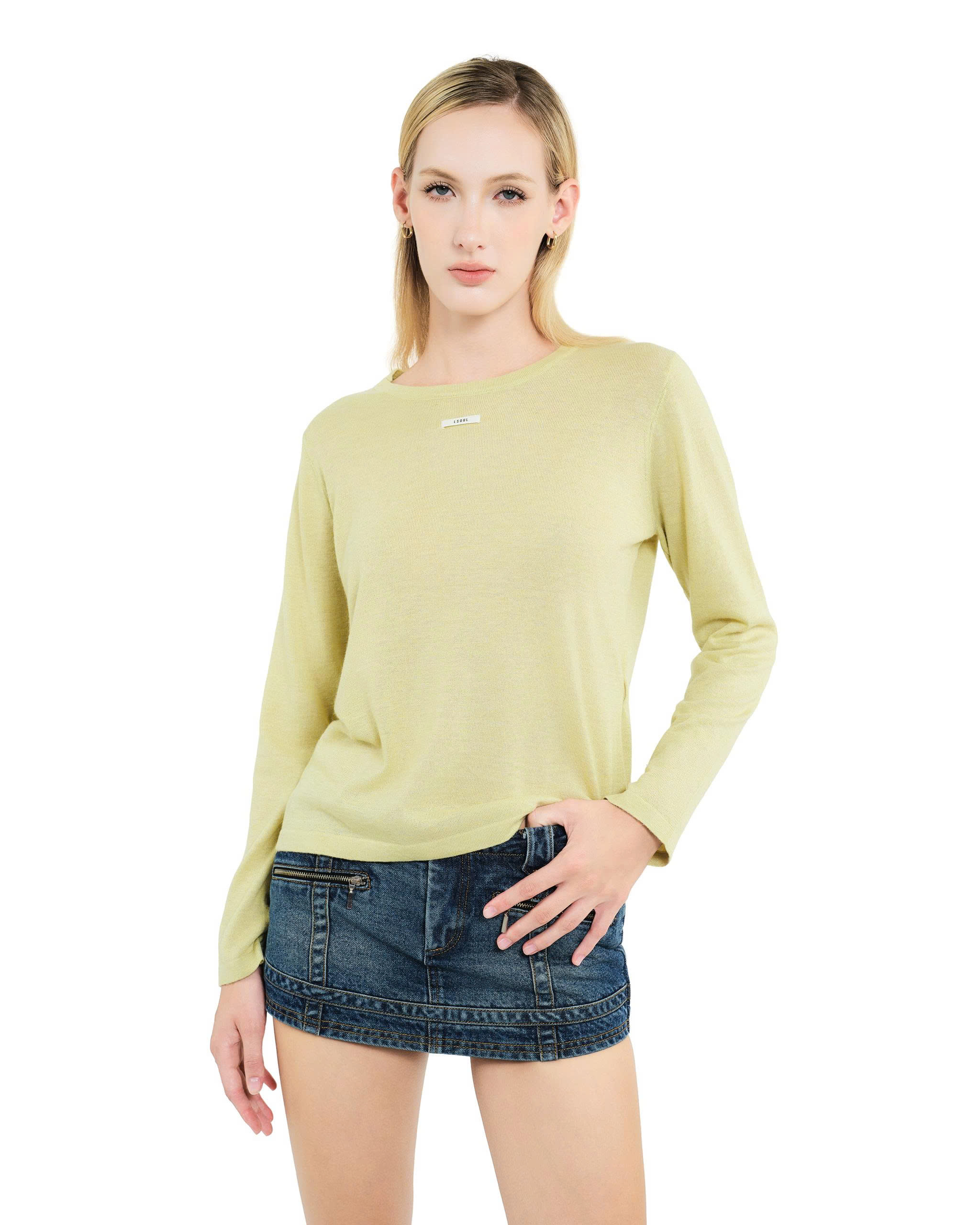 Tay dài, cổ tròn, đính logo dưới vòng cổ.