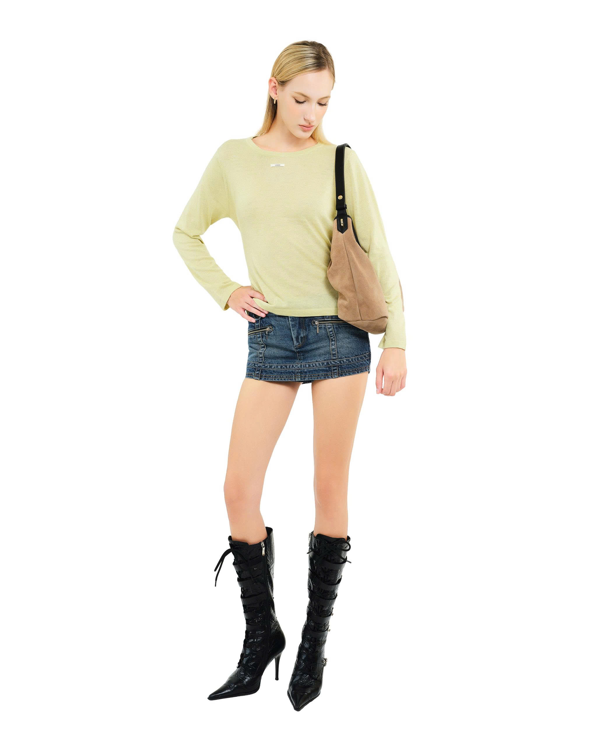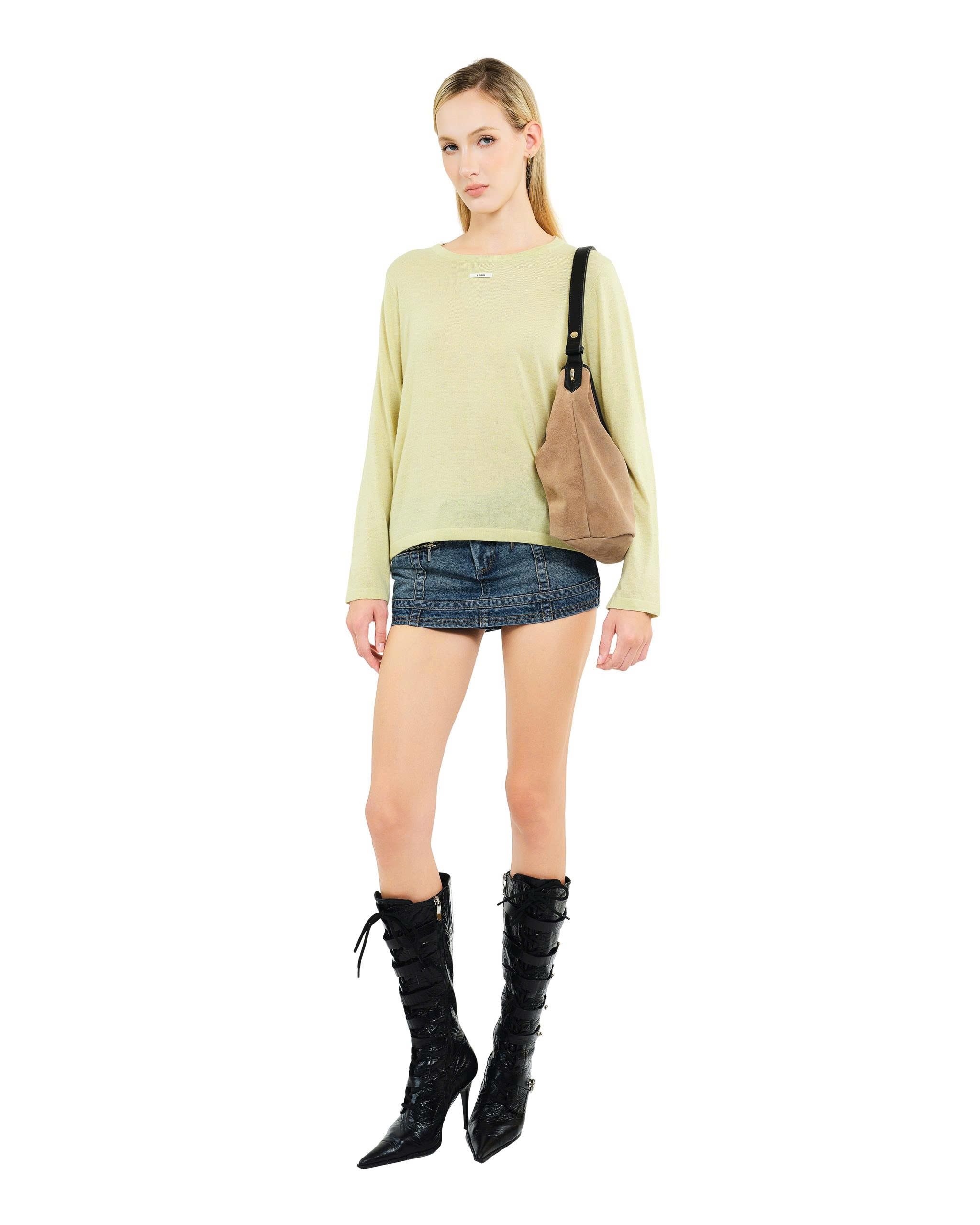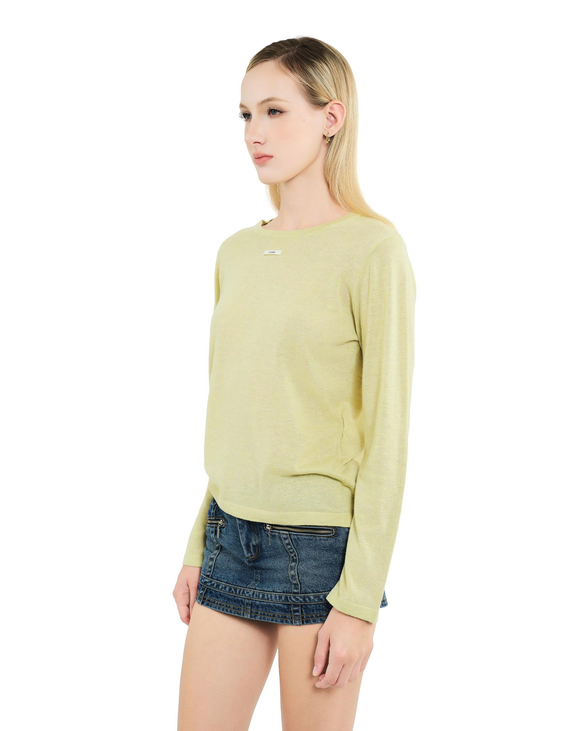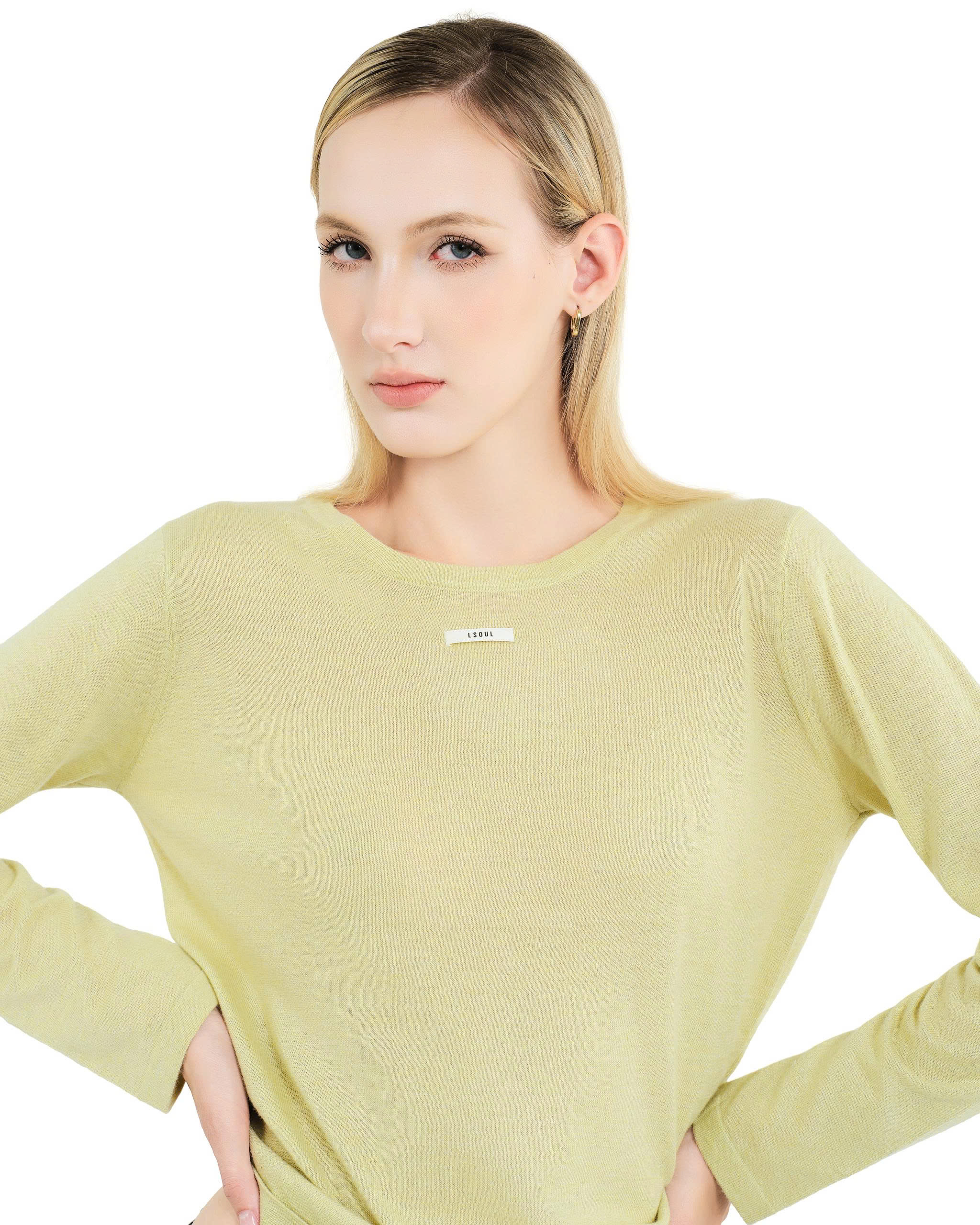 Tay dài, cổ tròn, đính logo dưới vòng cổ.