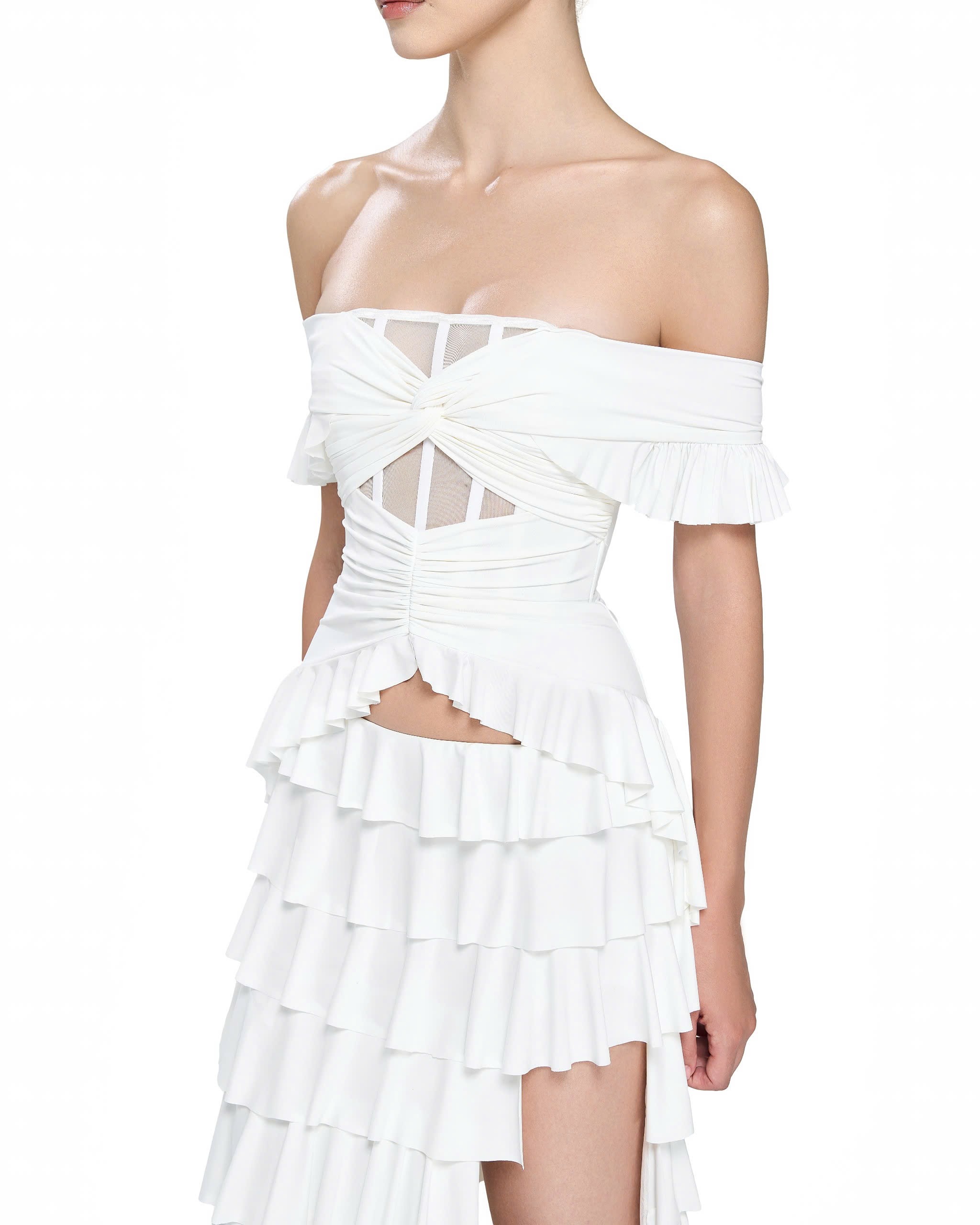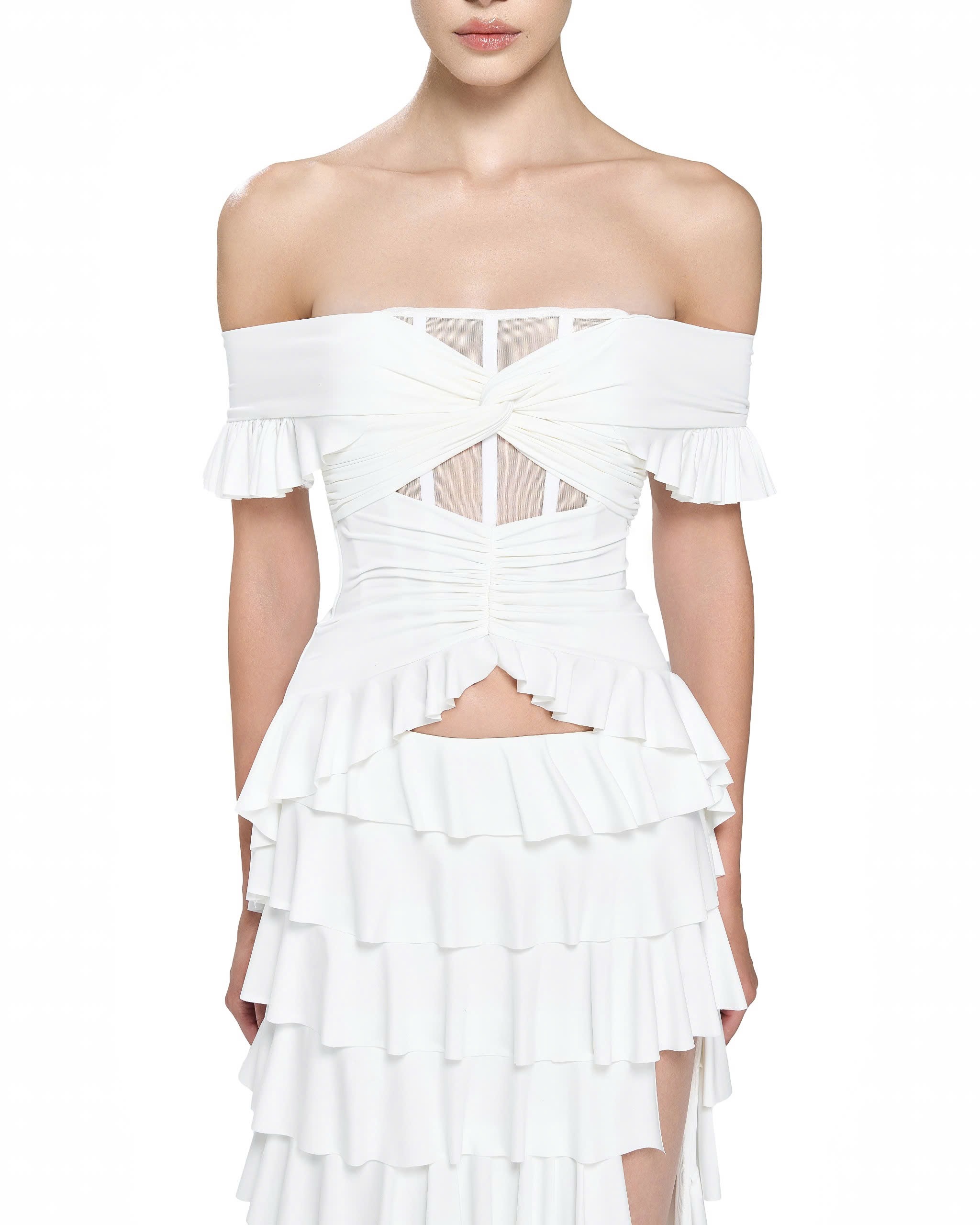 Chi tiết xoắn vải phía trước, phía sau đan dây.