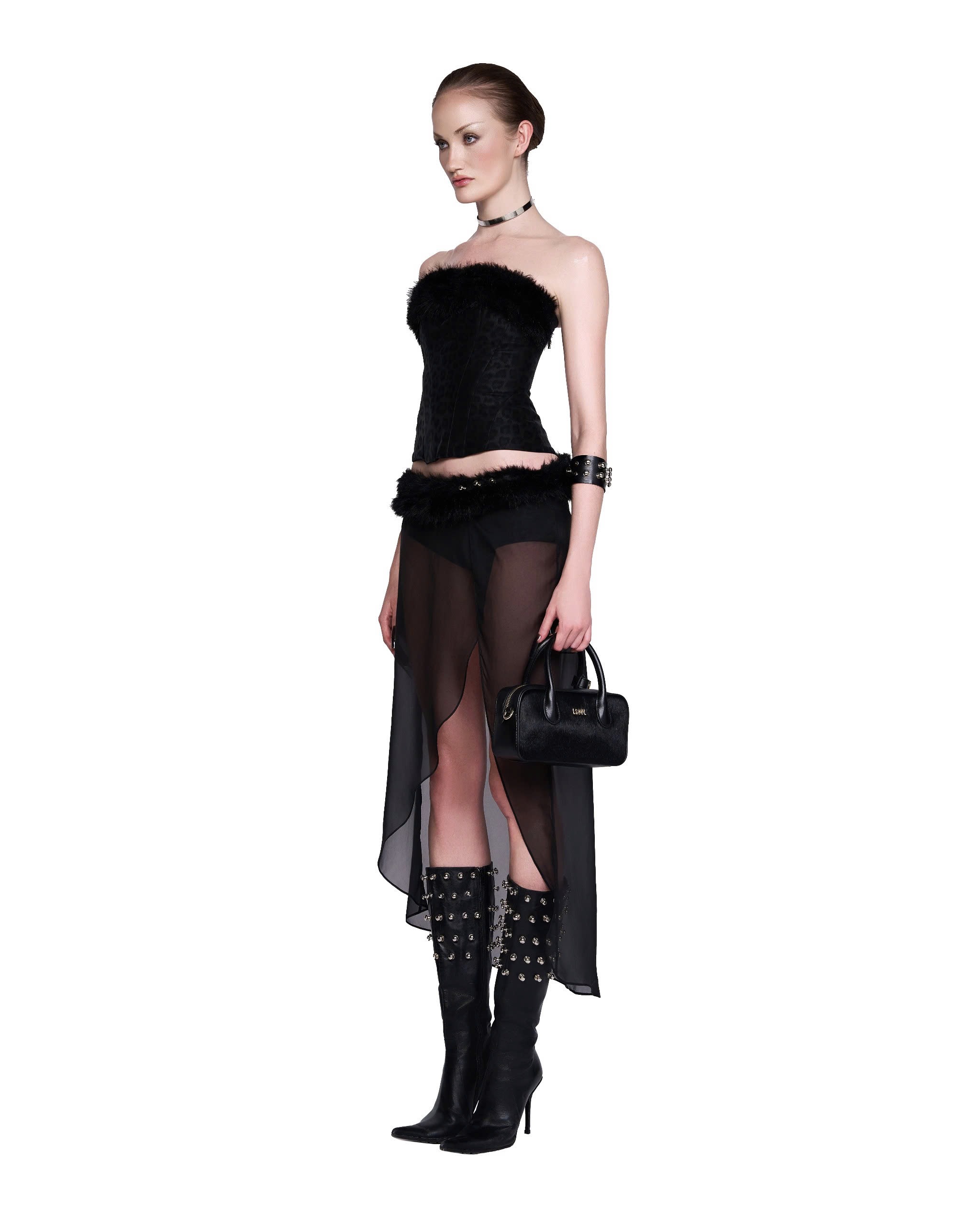กระโปรงผ่าข้างด้วยวัสดุผ้าซีทรูสร้างความนุ่มนวลและเย้ายวน ผสมผสานกับเข็มขัดขนเฟอร์ตกแต่งด้วยหมุดโลหะเพิ่มความเซ็กซี่และมีสไตล์อย่างลงตัว