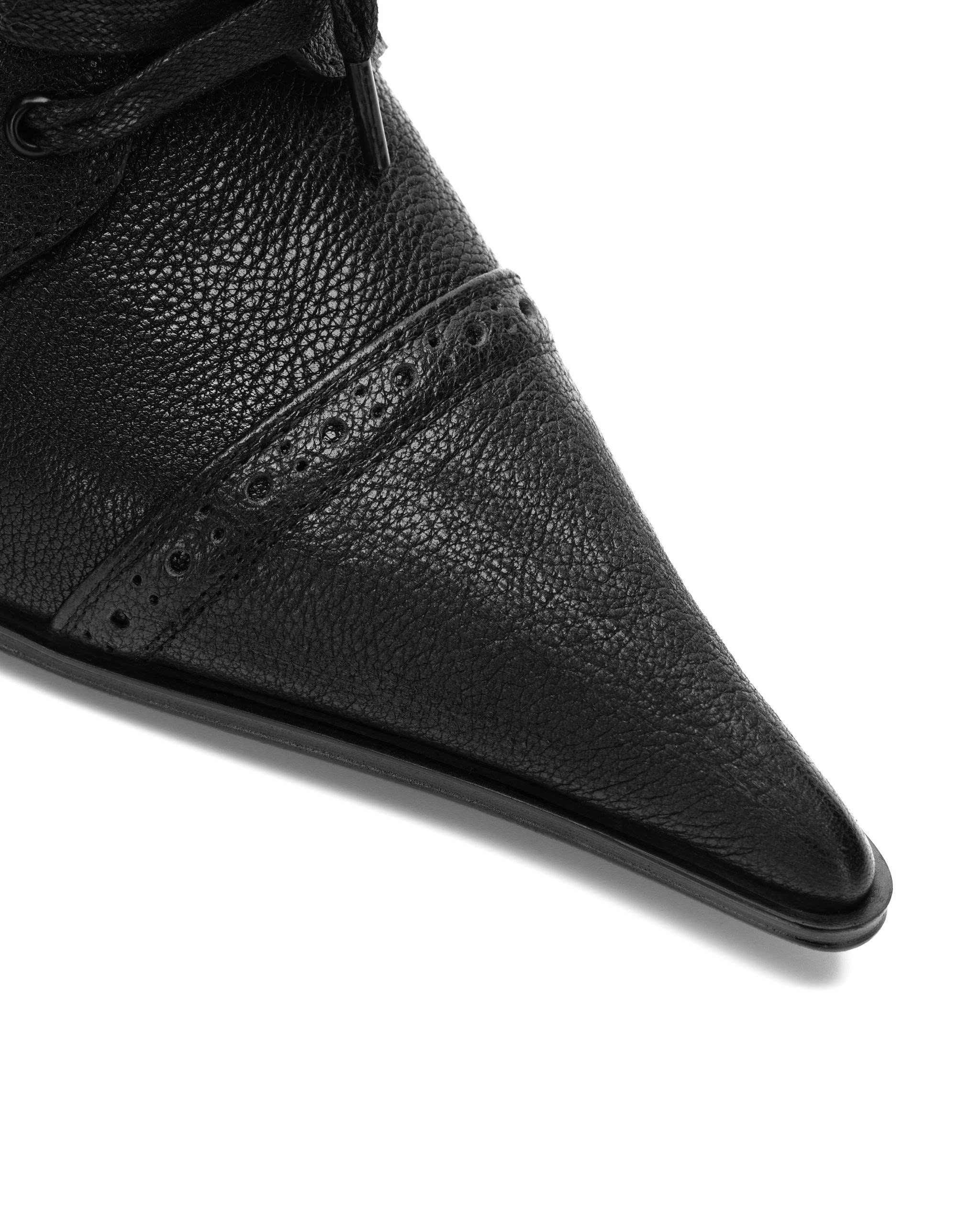 Leather straps adorned with metal buckle running along the shoe shaft.