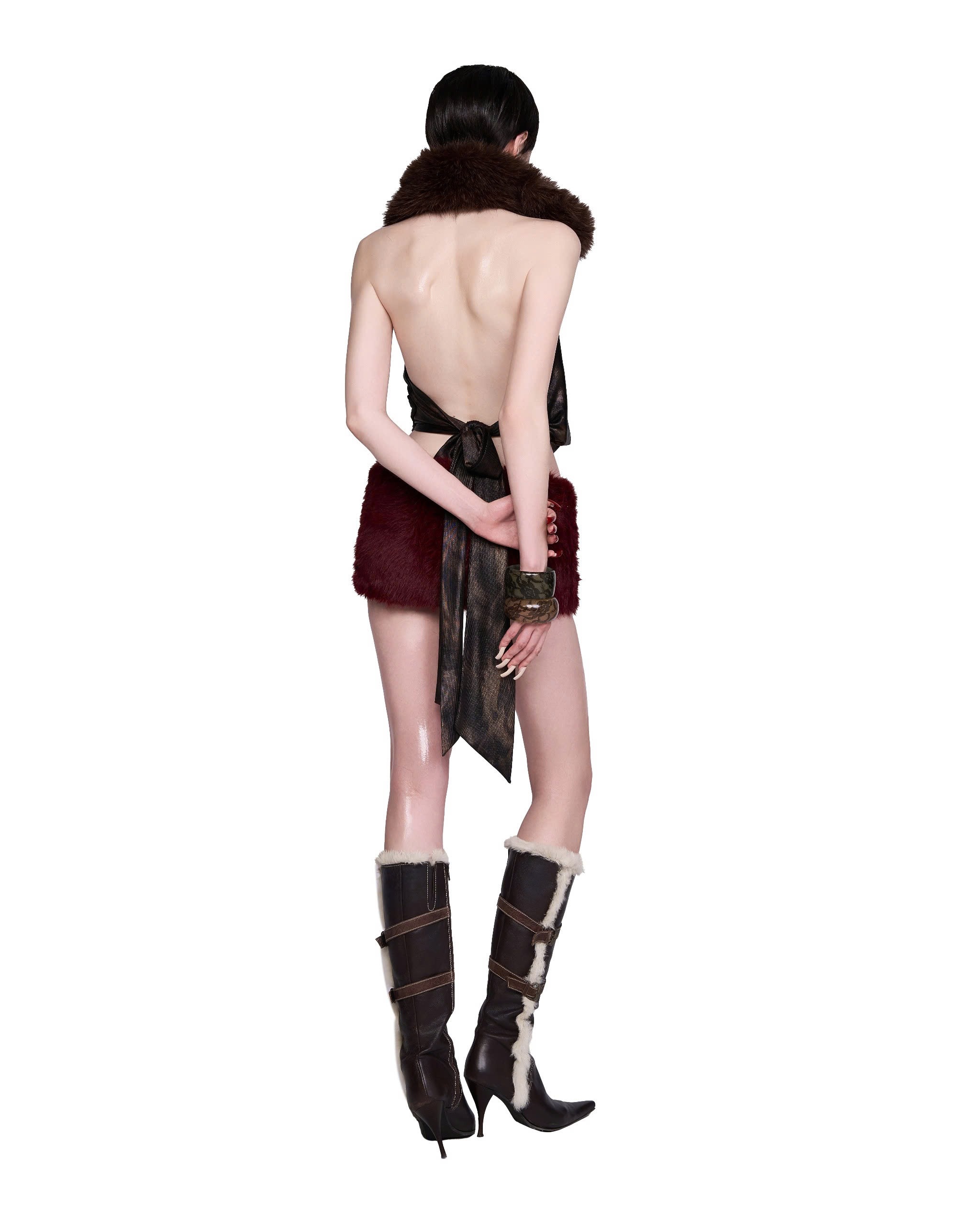 เสื้อคอถ่วง วัสดุหนังเงานุ่มที่สร้างความหรูหราและเย้ายวน พร้อมดีไซน์การจับจีบซ้อนชั้นมาคู่กับปลอกคอขนเฟอร์ตกแต่งด้วยหมุดโลหะเด่นสะดุดตา