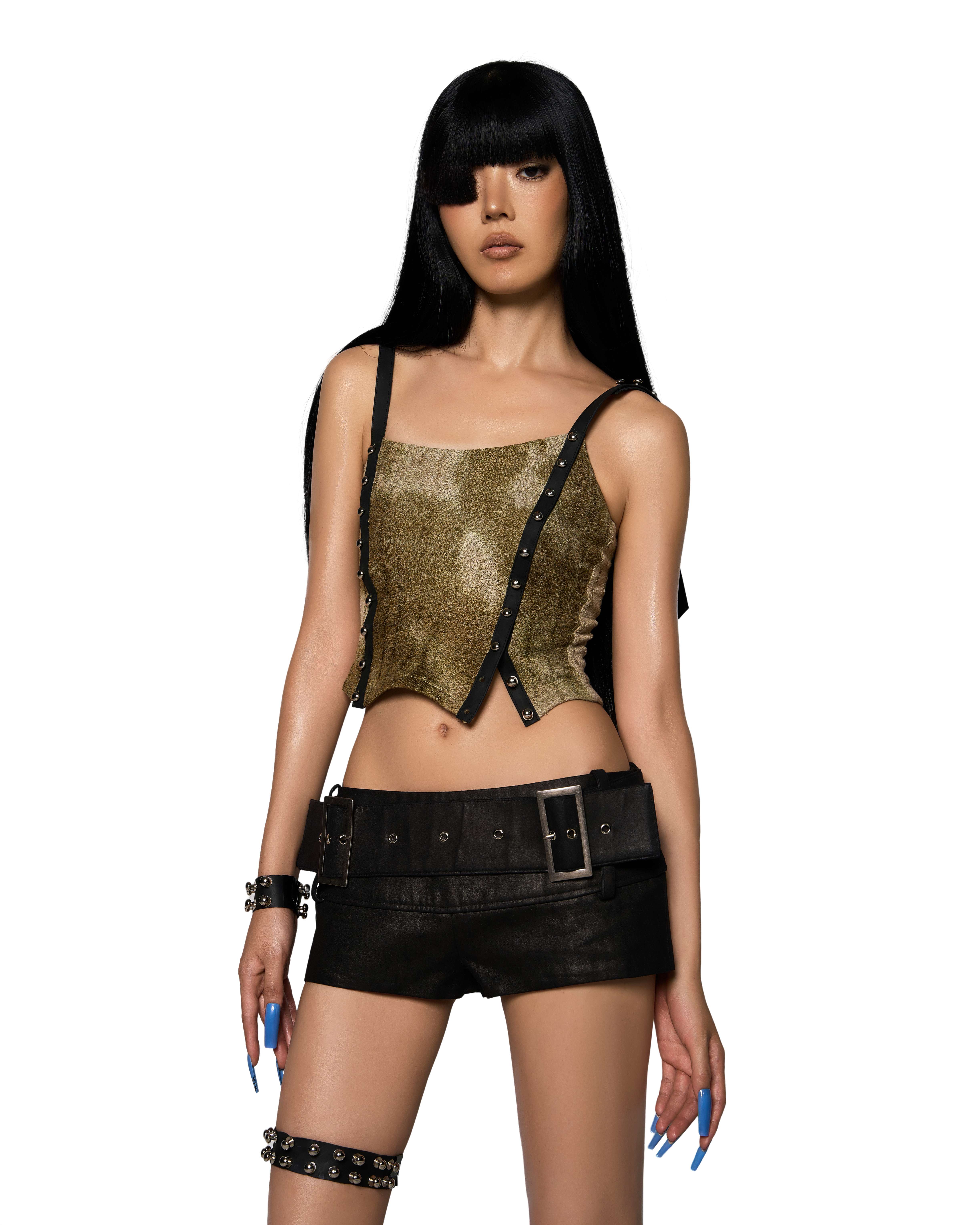 • Top: Crafted from high-quality imported textured stretch fabric, featuring exquisite handcrafted tie-dye techniques. This fitted crop top showcases a sensual square neckline that beautifully accentuates the shoulders. The two premium cowhide leather straps with studded buttons run from the shoulders down the sides of the top, allowing for adjustable cut-outs along the garment
