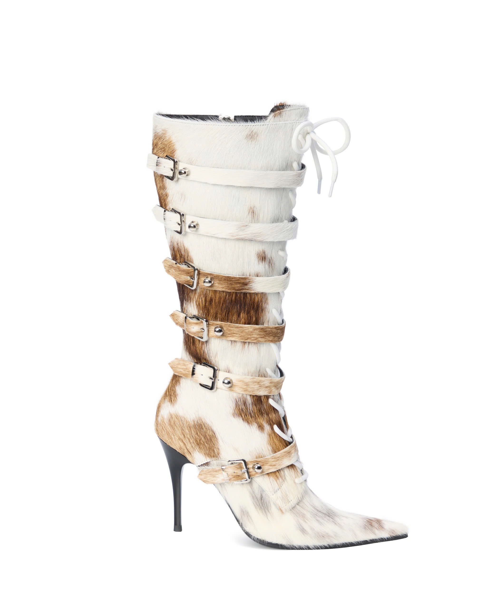 Leather straps adorned with metal studs and buckle running along the shoe shaft.