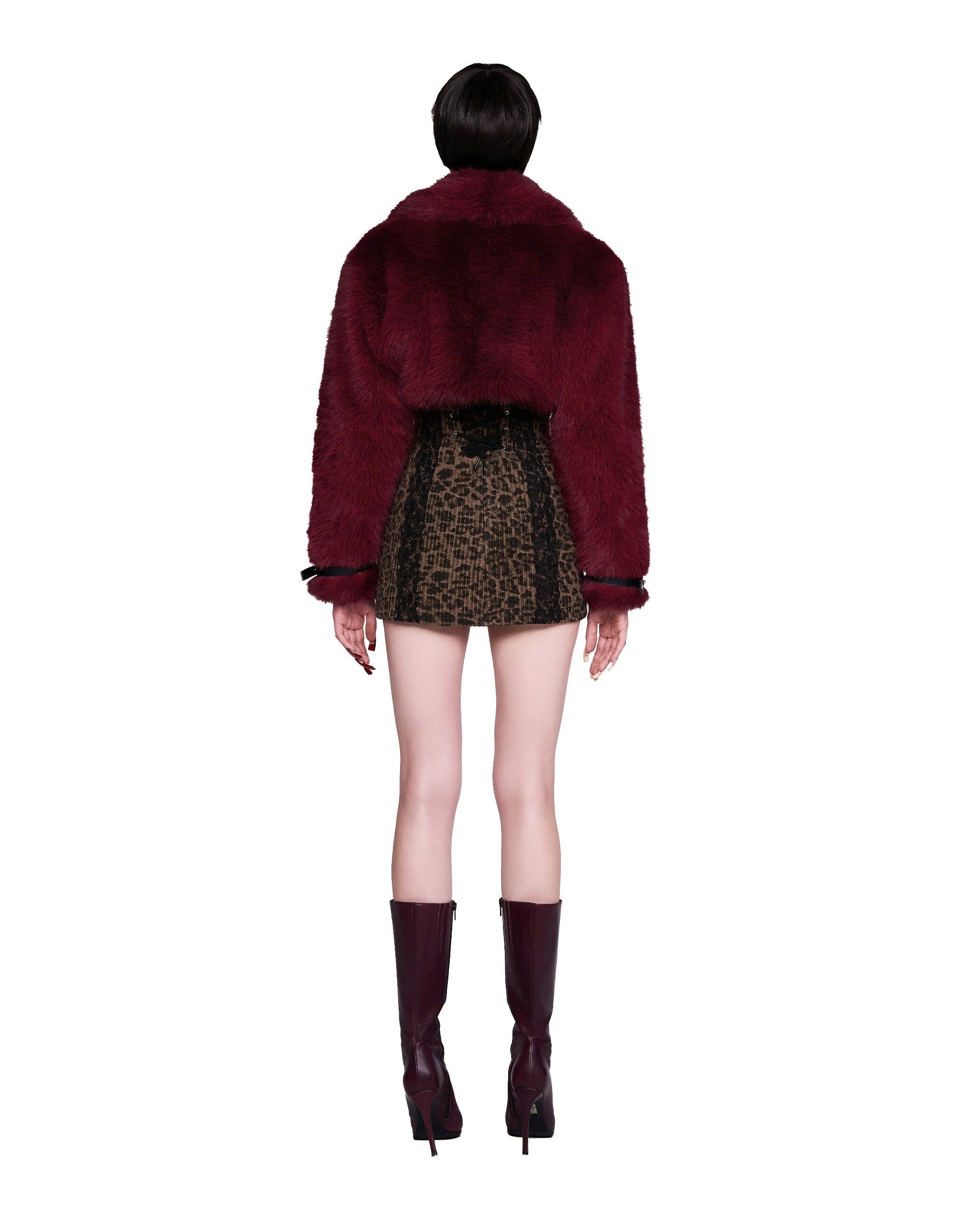 แจ็คเก็ตขนเฟอร์สีแดงไวน์หนานุ่มสุดหรู ดีไซน์ทันสมัย ผสมผสานกับดีเทลสายหนังสีดำและหมุดโลหะ สะท้อนความหรูหราและความโดดเด่น
