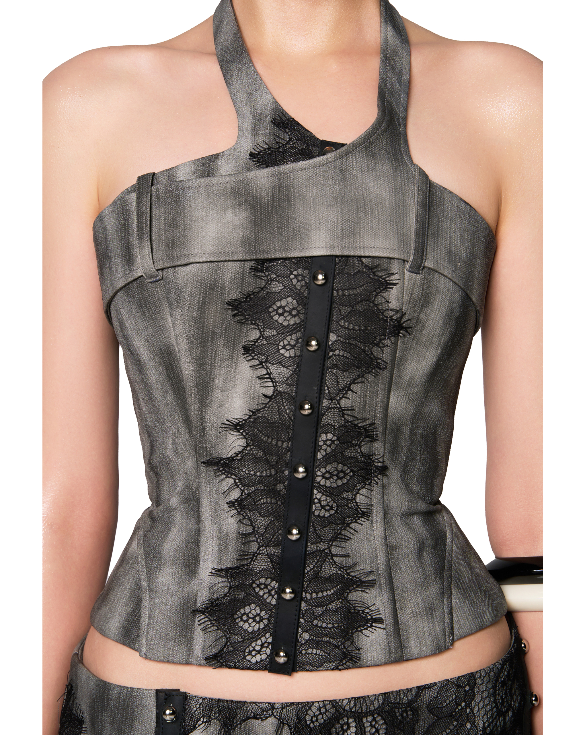 • Top: A standout corset design featuring a creatively styled neckline that adds a bold and striking touch. The alluring black lace detail at the front accentuates its sensual appeal, while the soft khaki fabric provides comfort without compromising on its edgy and powerful character.