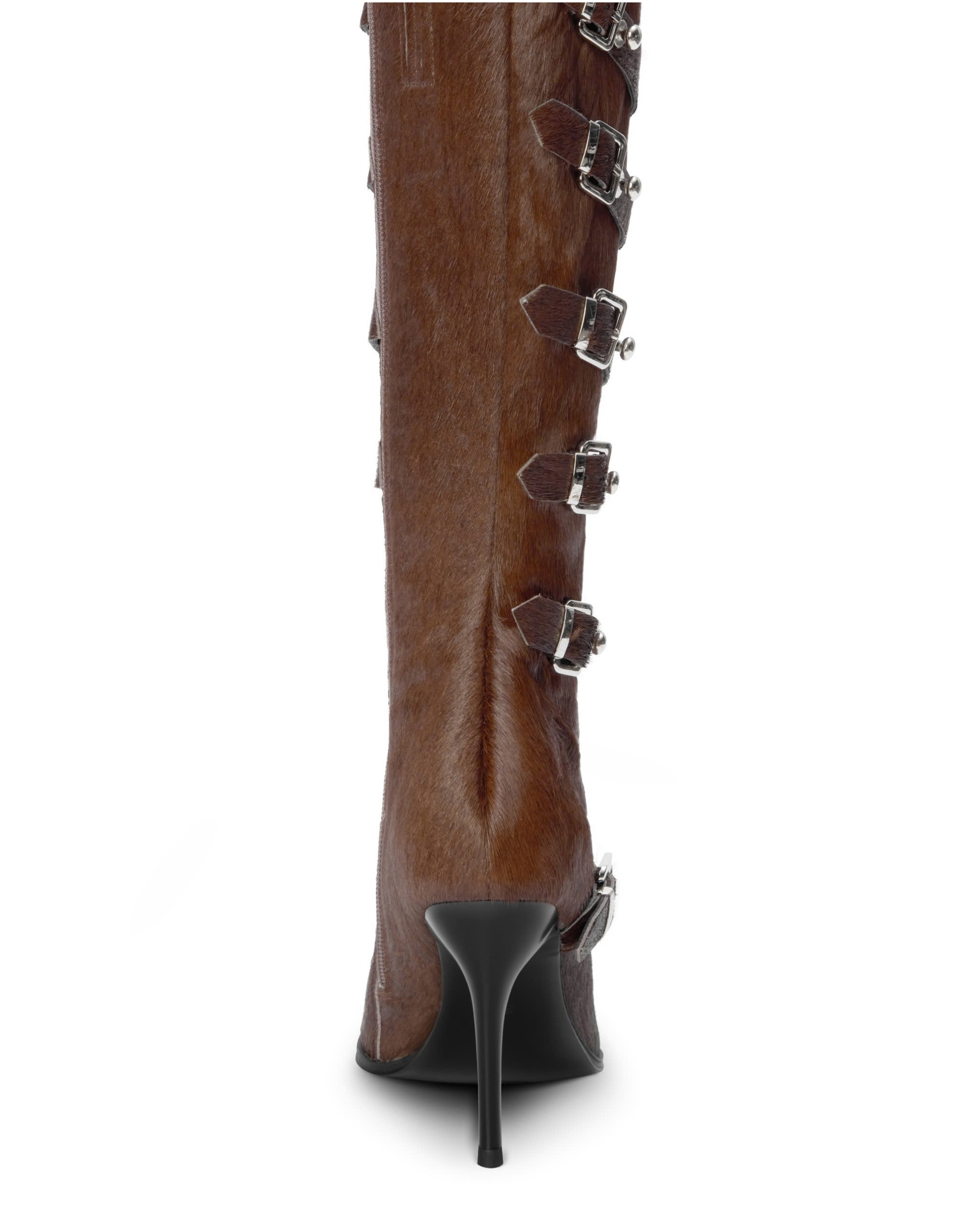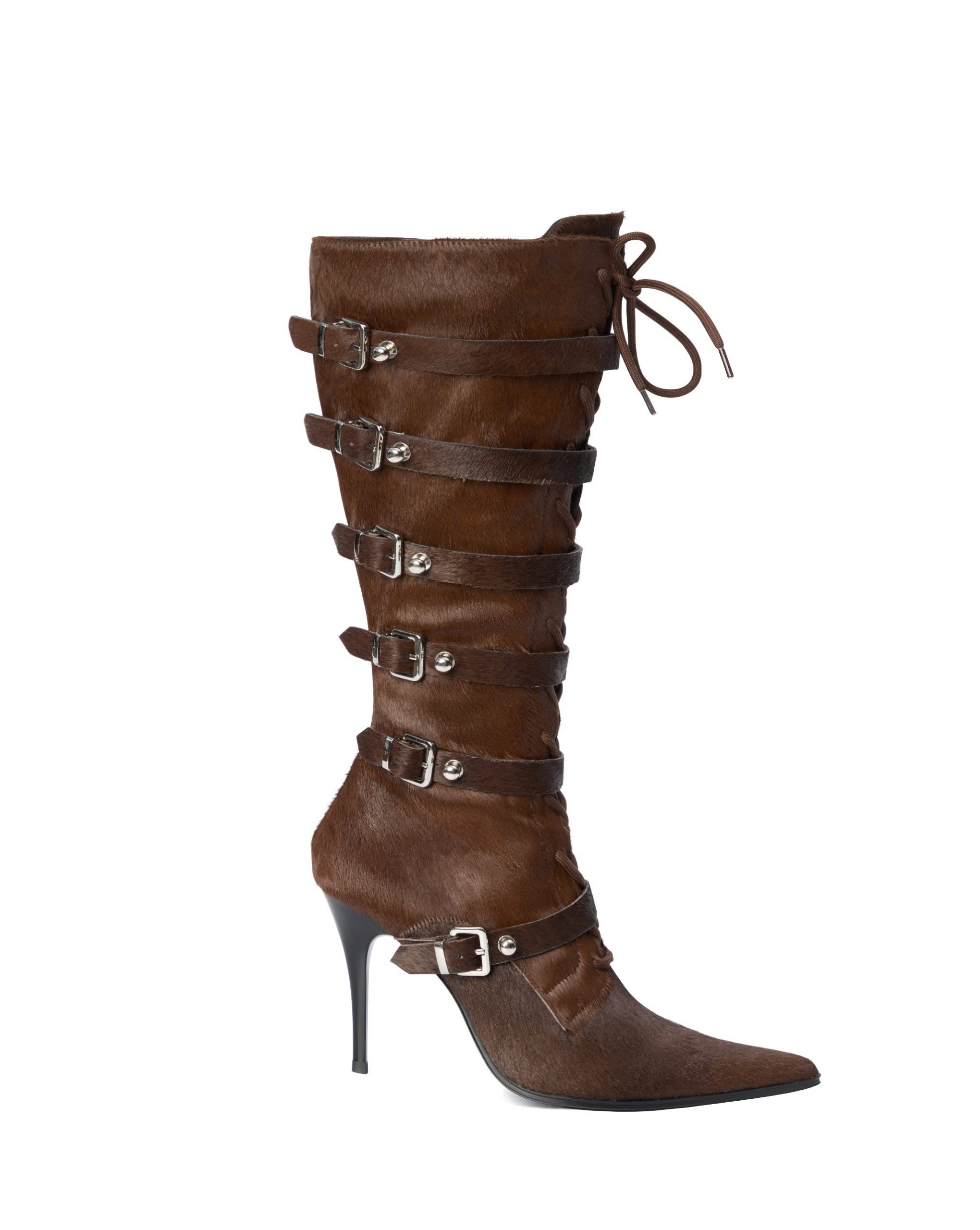 Leather straps adorned with metal studs and buckleย running along the shoe shaft.