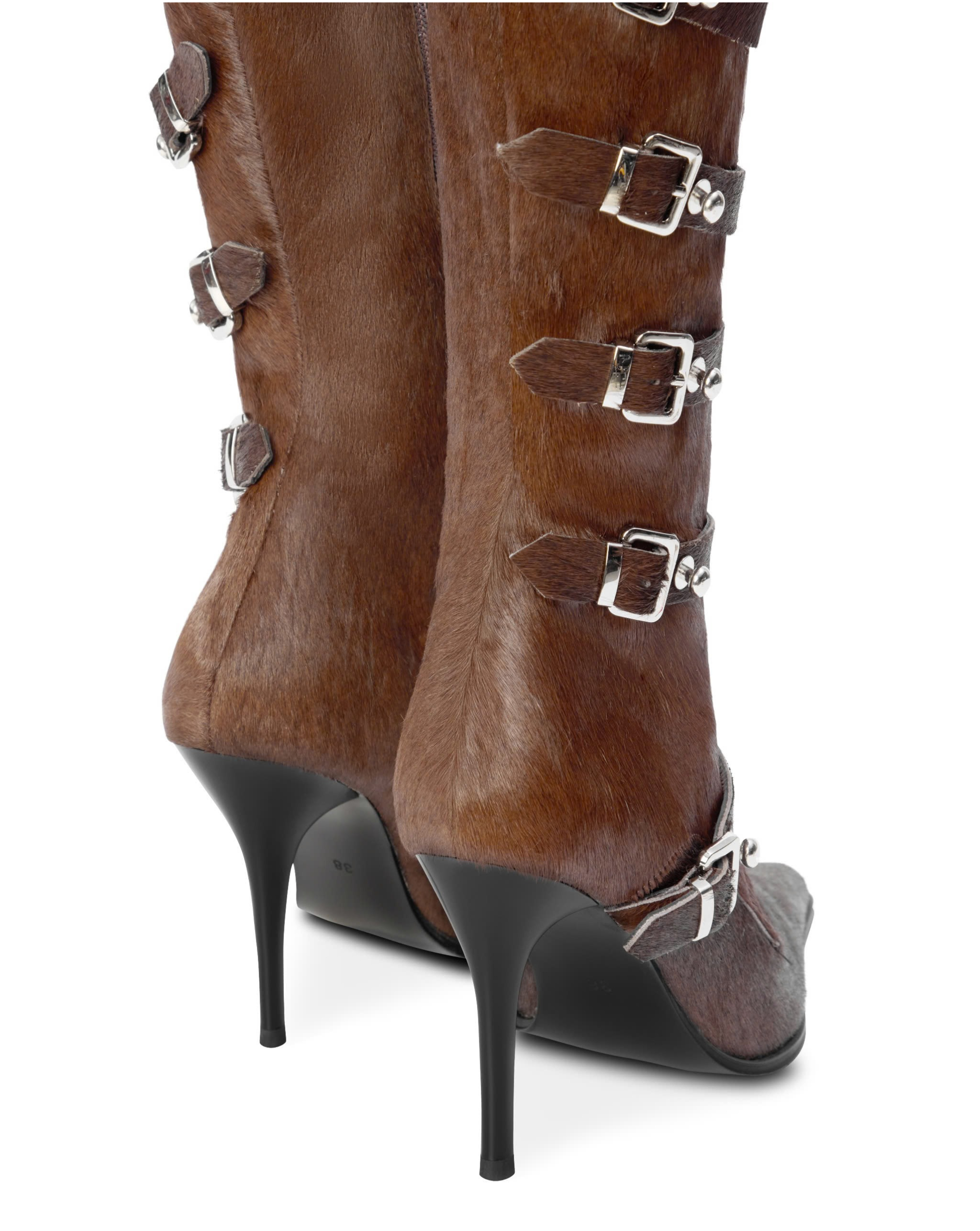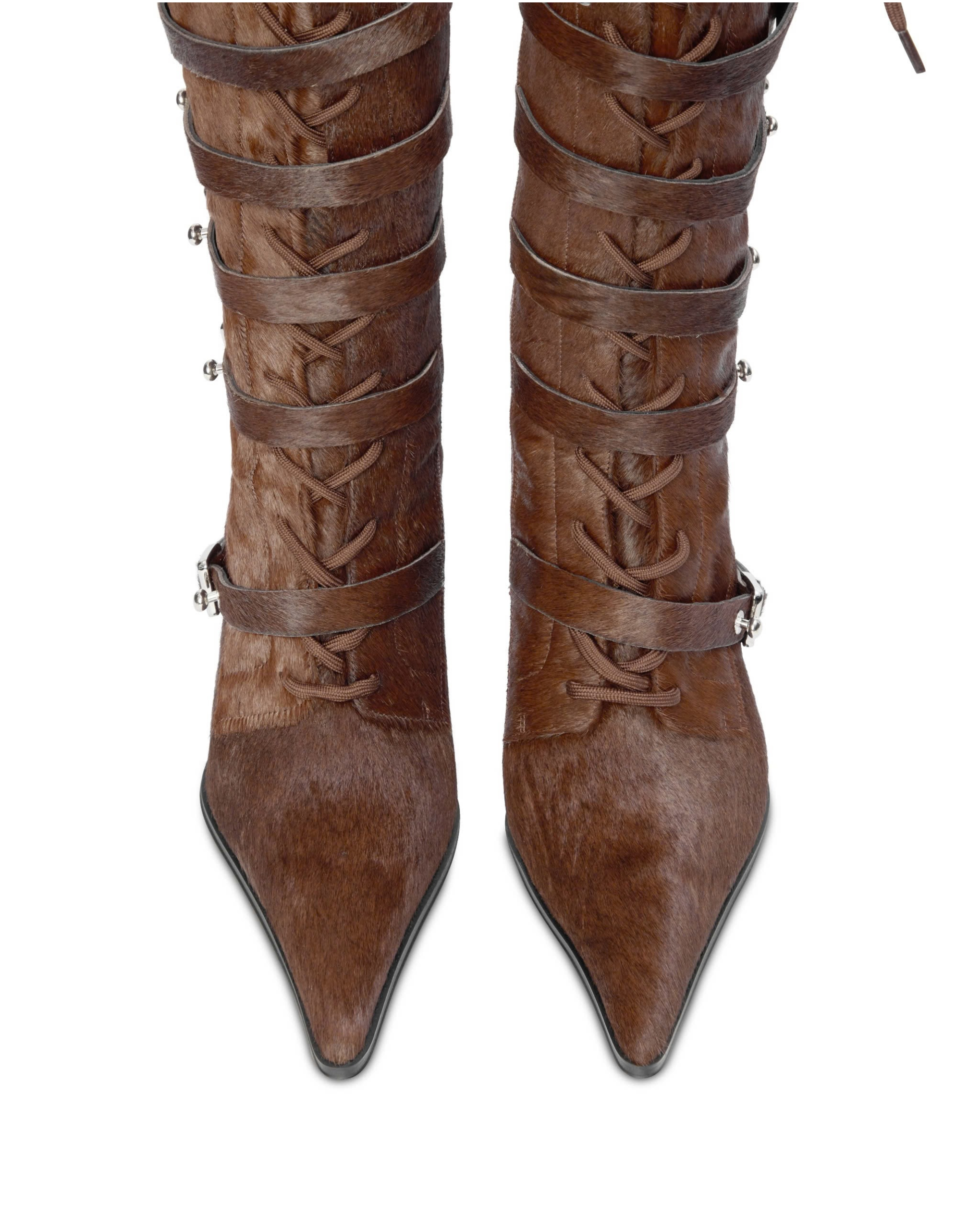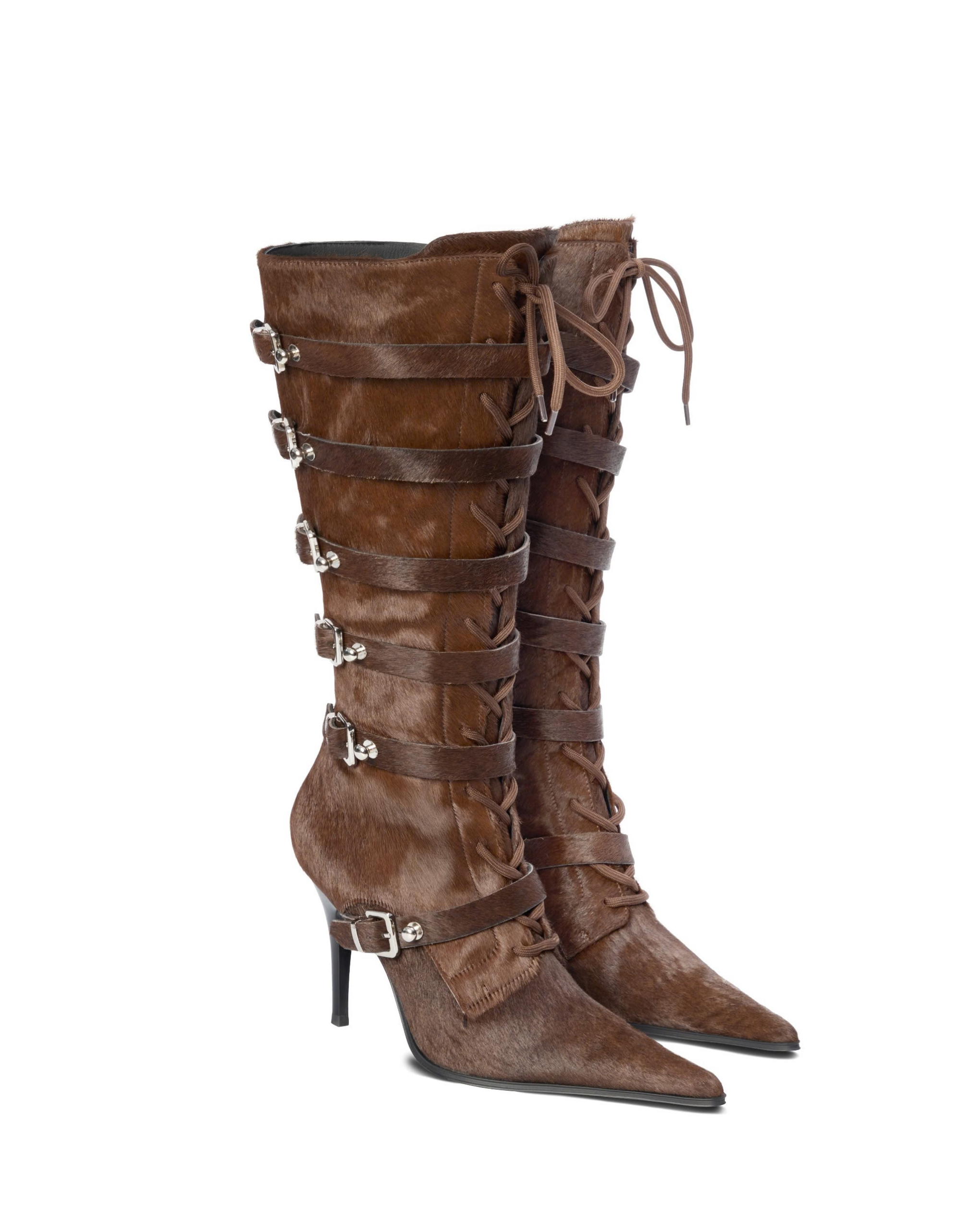 Calf-high shaft, featuring front lace-up detailing and a side metal zipper.