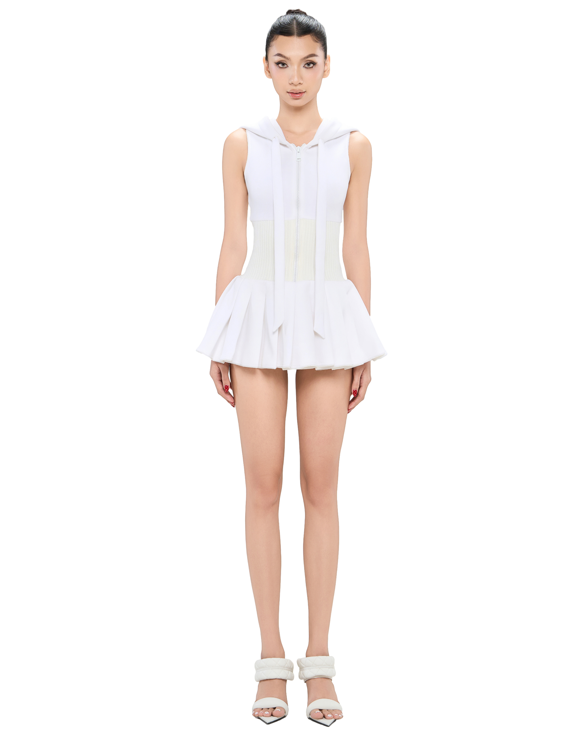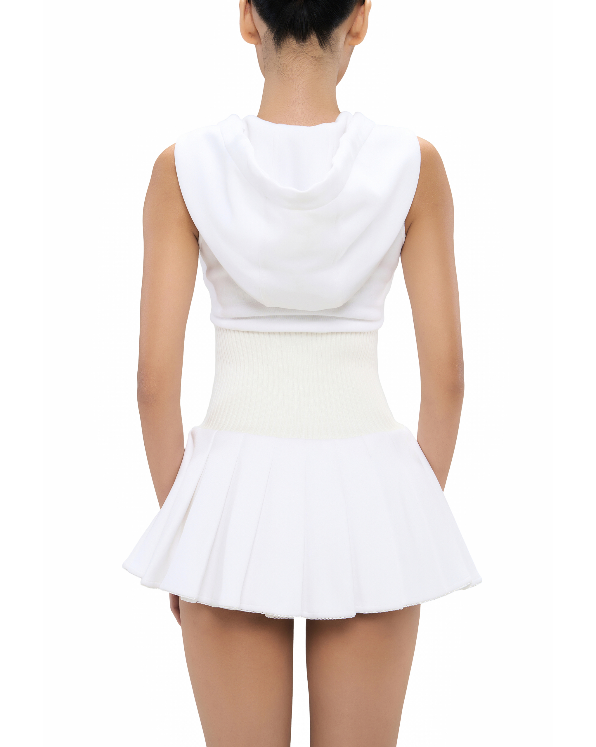 Wide ribbed waistband. Soft pleated hem.